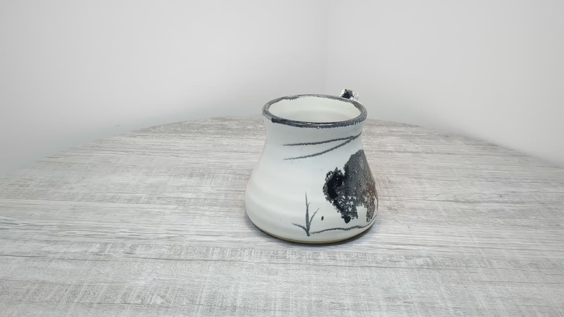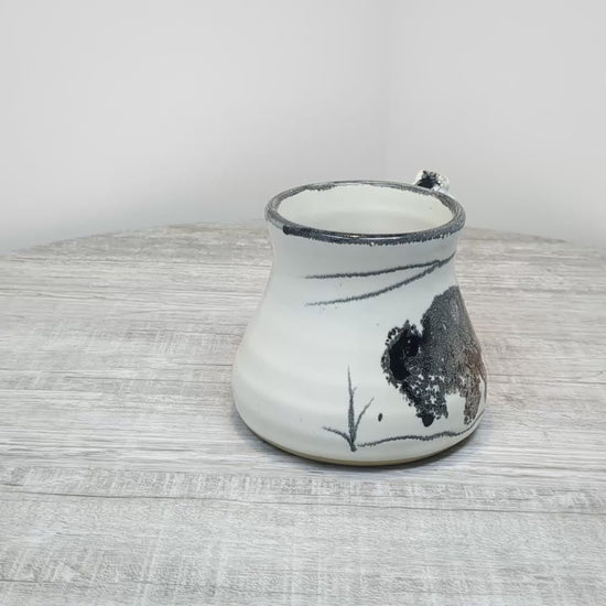 Iconic Alain Favre Bison themed pottery mug. This is a beautiful hand-made pottery mug by ceramicist Alain Favre from Red Deer Alberta. Mug features a very effective sponged imprint of a Bison traversing winter prairie landscape. Pottery is signed on base.