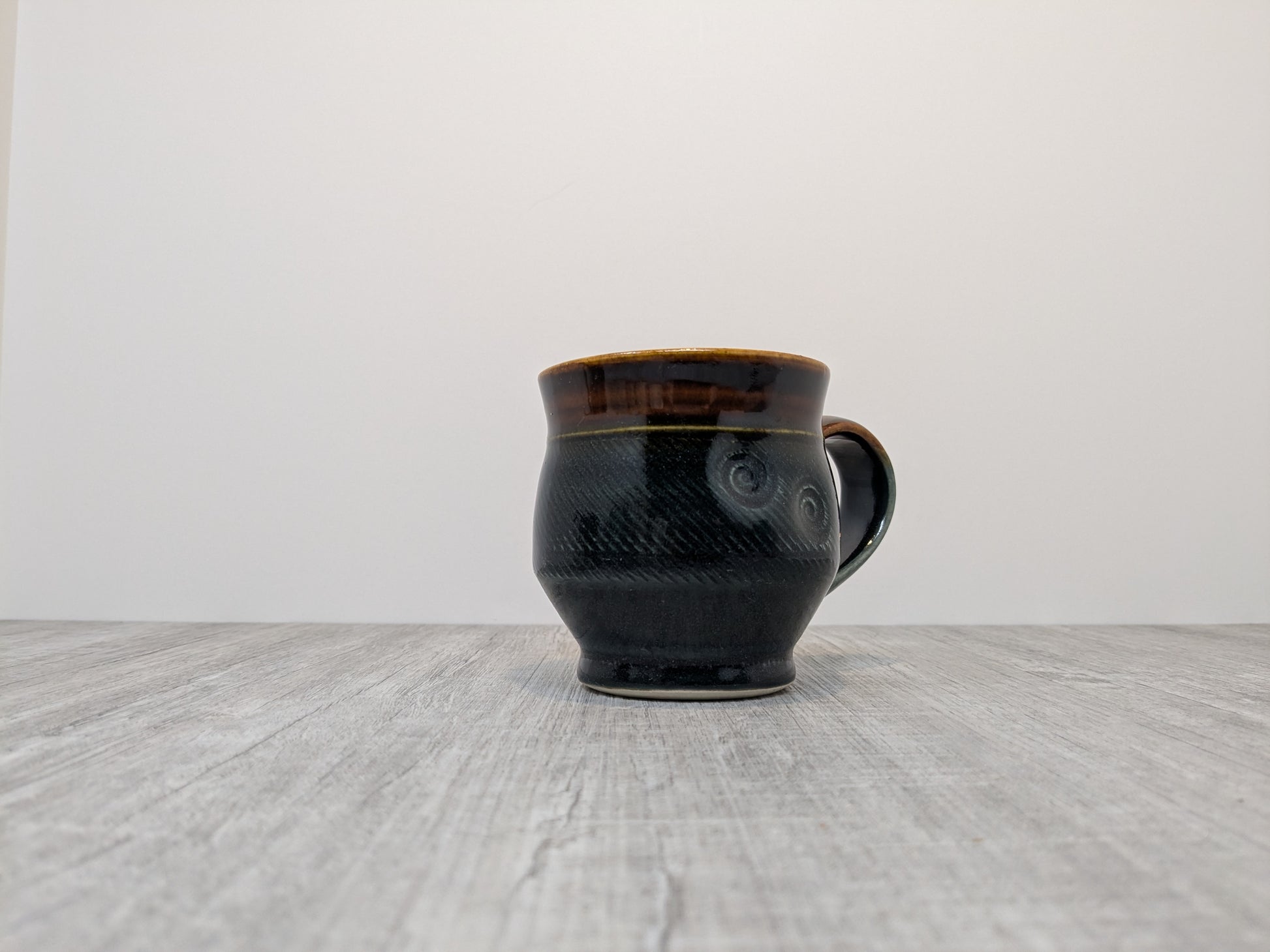 Aven-Hill Studio Pottery Mug, Edmonton based potters John Wilson and Jacqueline Lemieux-Wilson. These are very well thrown mugs with fine details, iron oxide coloured rim with a dark blue-gray body. Comfortable 2 finger grip.