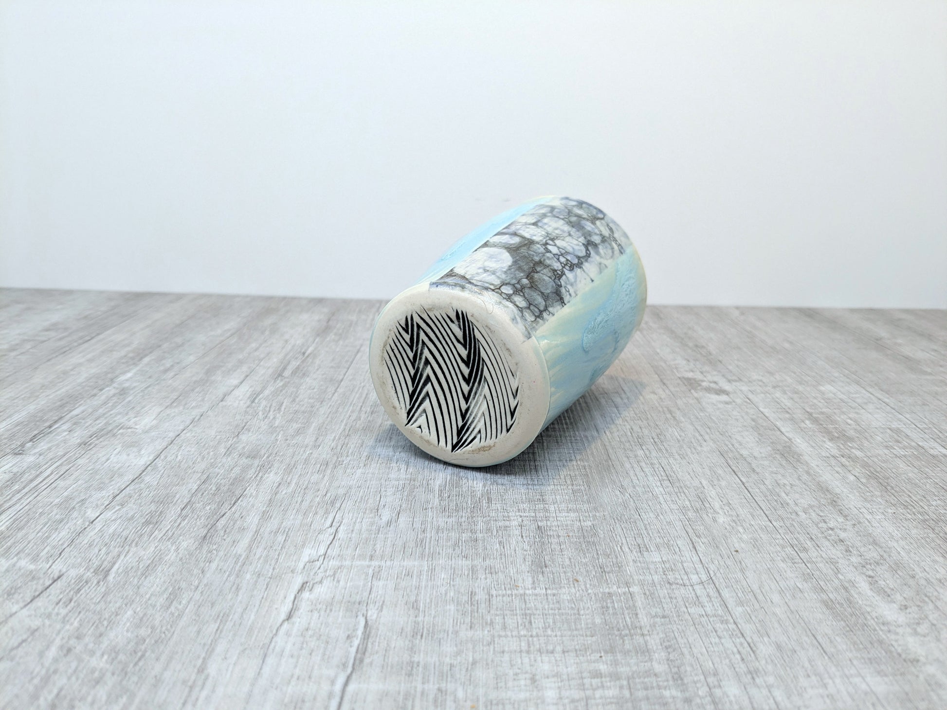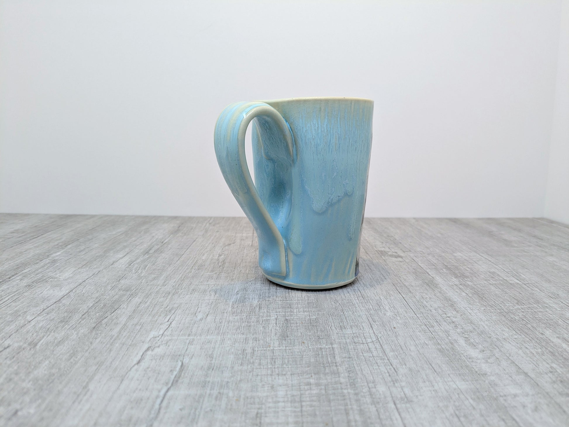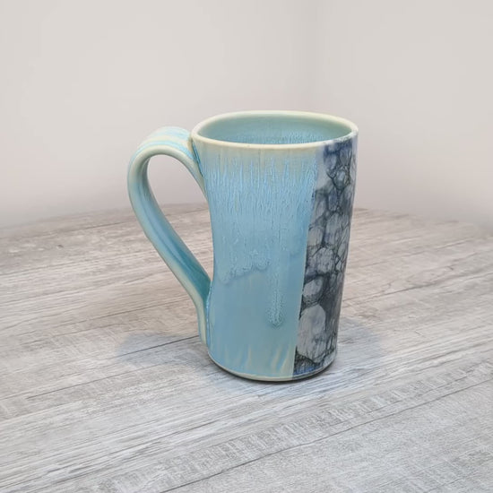 Studio Pottery light blue drip glaze mug with waterfall abstract pebble design band.