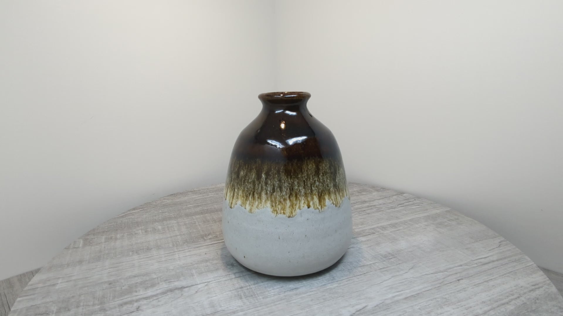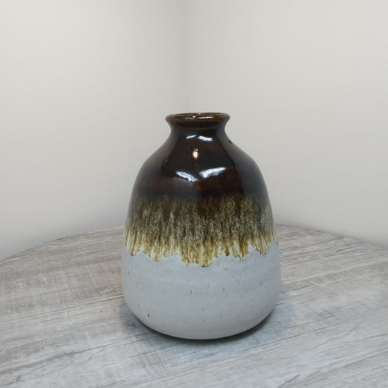 Brookmere pottery 1972-2000 operated by James Shearer in the Nicolas Valley, British Columbia. Beautiful vase reminicent of 1970's West German pottery, fantastic transitioning underglaze from oxide brown to cream. Vase is in excellent condition with no chips or cracks