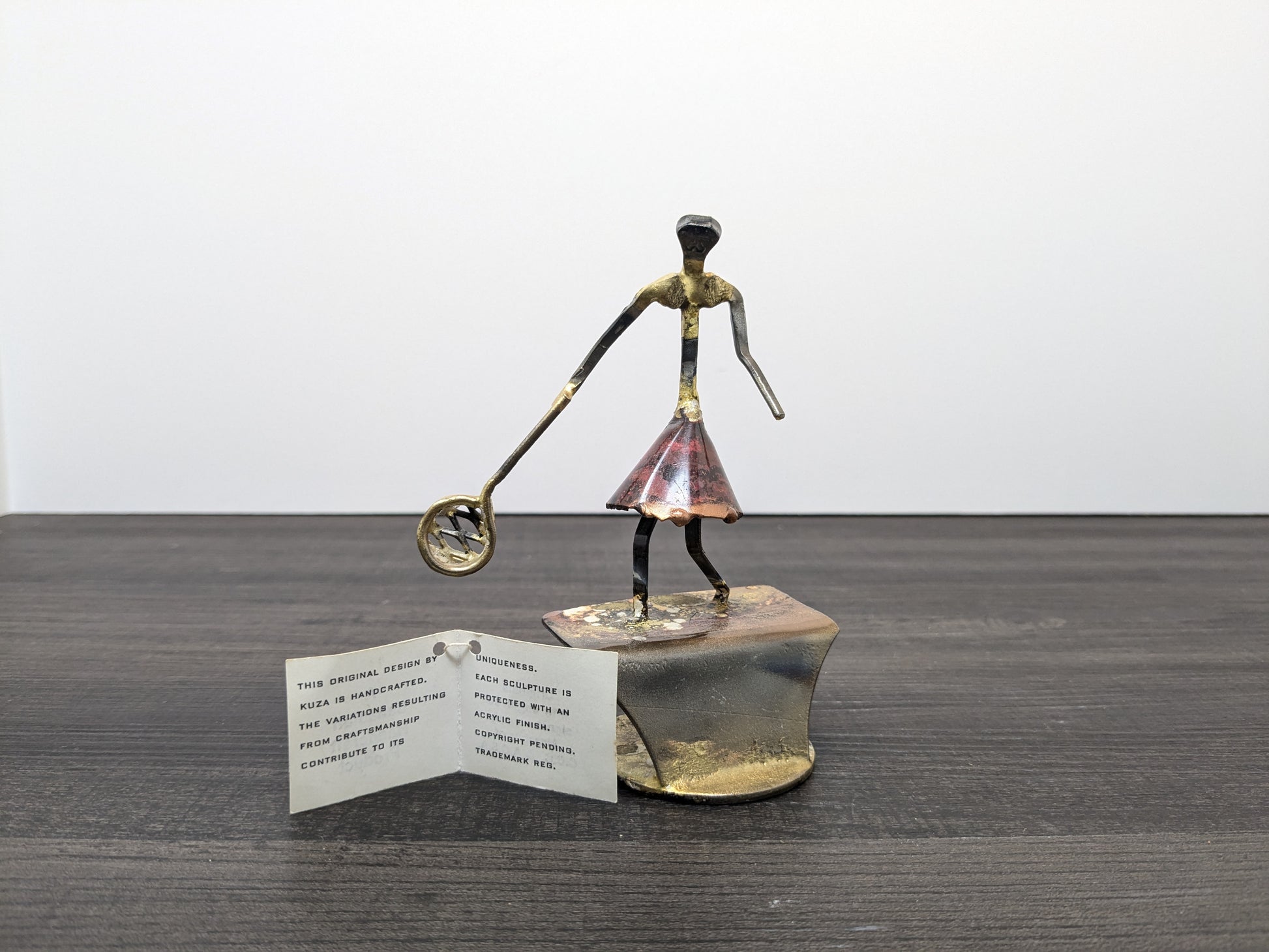 1970's vintage signed metal sculpture features a female tennis player in a brutalist style. Made from old salvaged square head nails torched welded using brass. Sculpture features webbed tennis racket and enmaled skirt. Unique original creative design with attention to details. Sculpture is signed KUZA 78,