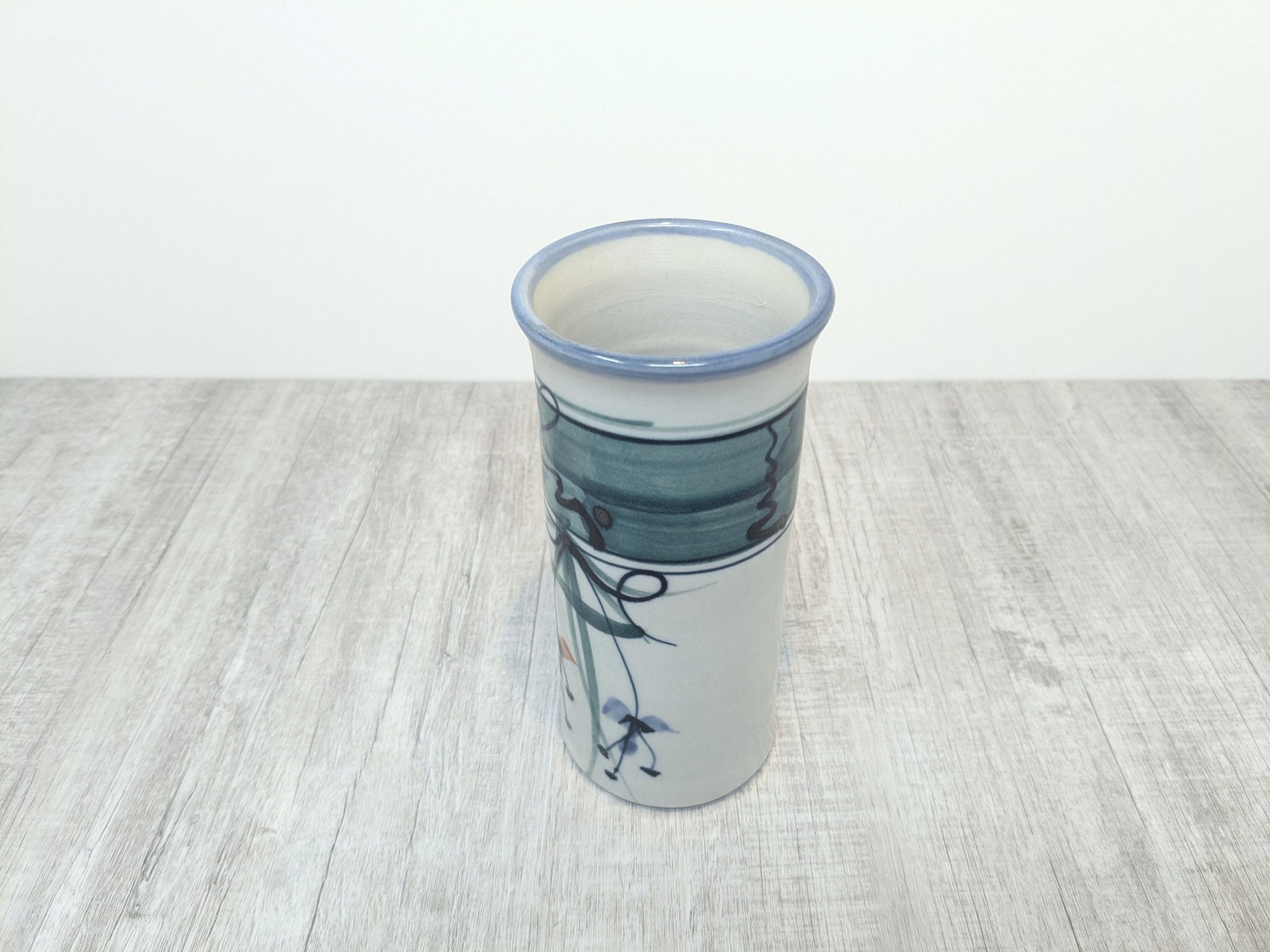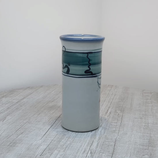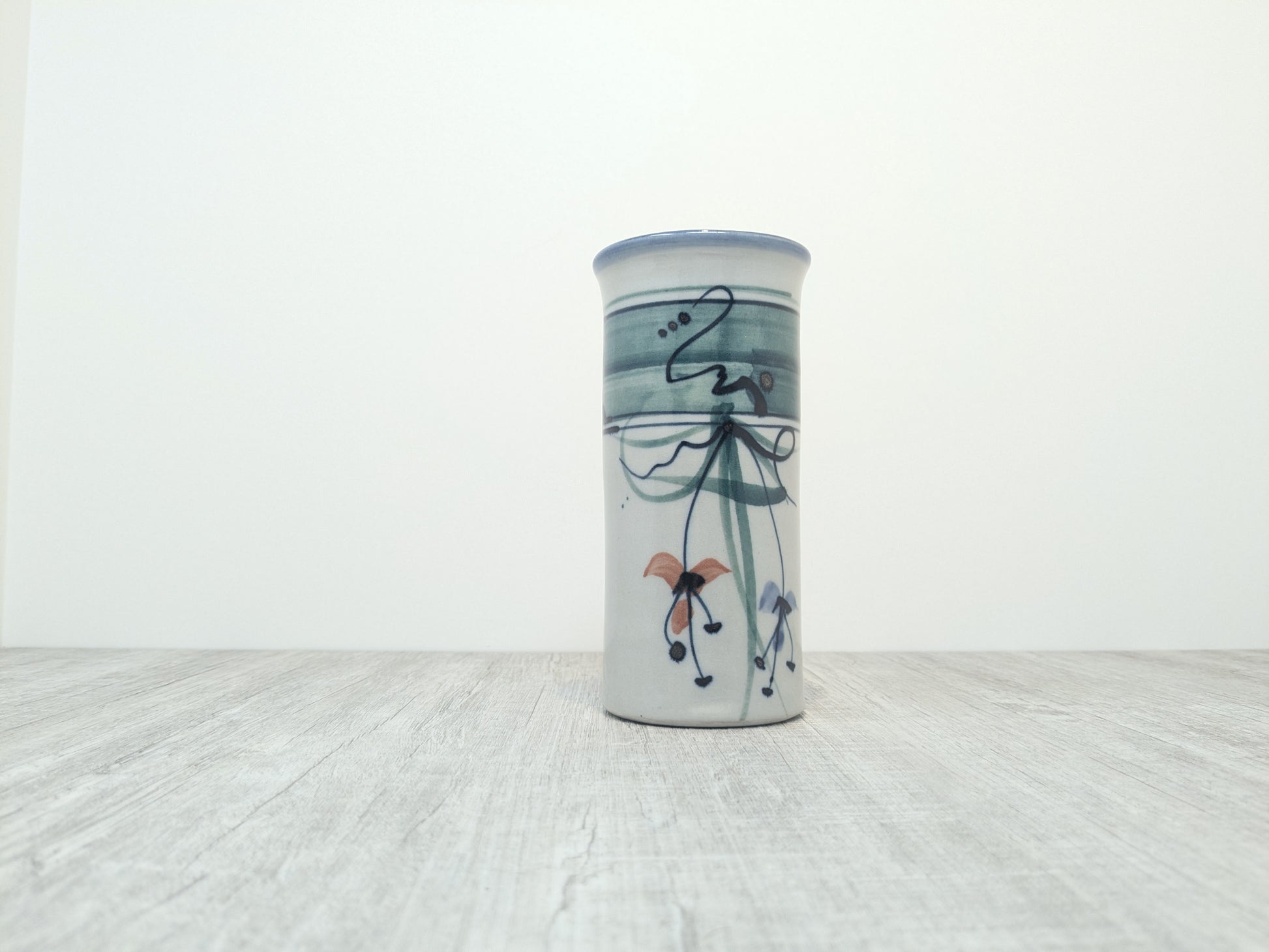Darrel Hancock studio pottery tumbler, tall slender drinking vessel with stylized flower design.
