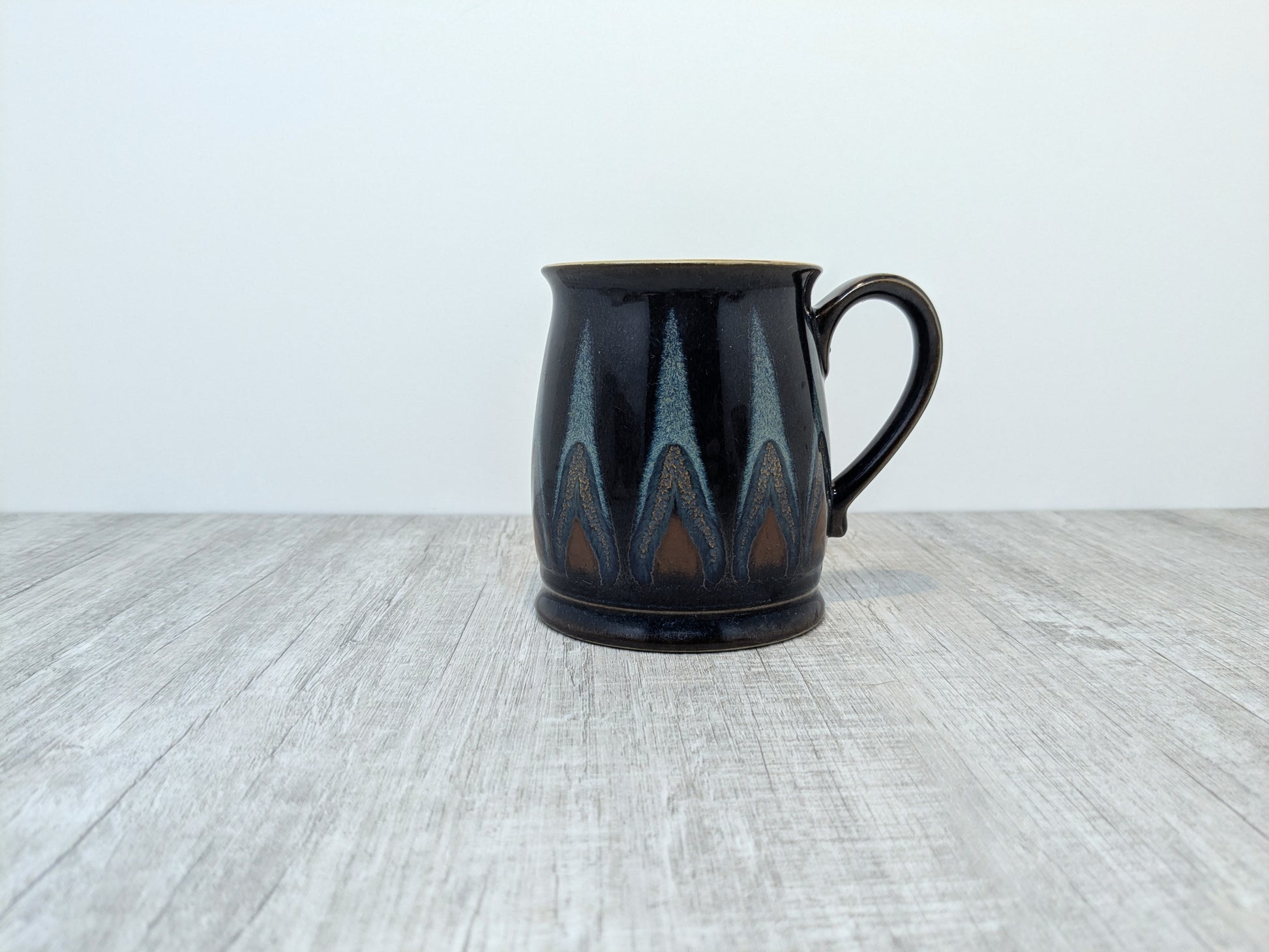 Beautiful Denby-Langley Tankard shaped mug with brown and blue flames rising from the base, with brown interior. Mug pattern was designed by Claire Bernard and produced by Denby, England in the mid 1990's. Mug is very clean, very little wear. Often referred to as the "Tudor Flame Mug"