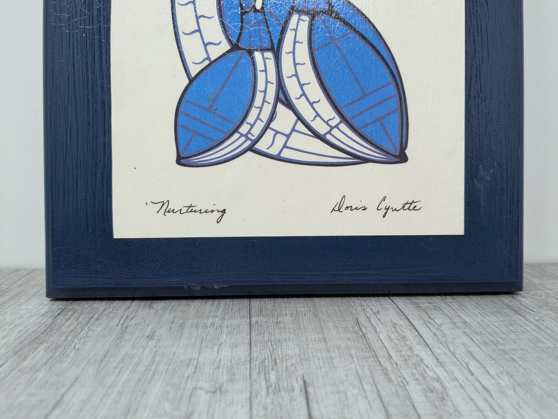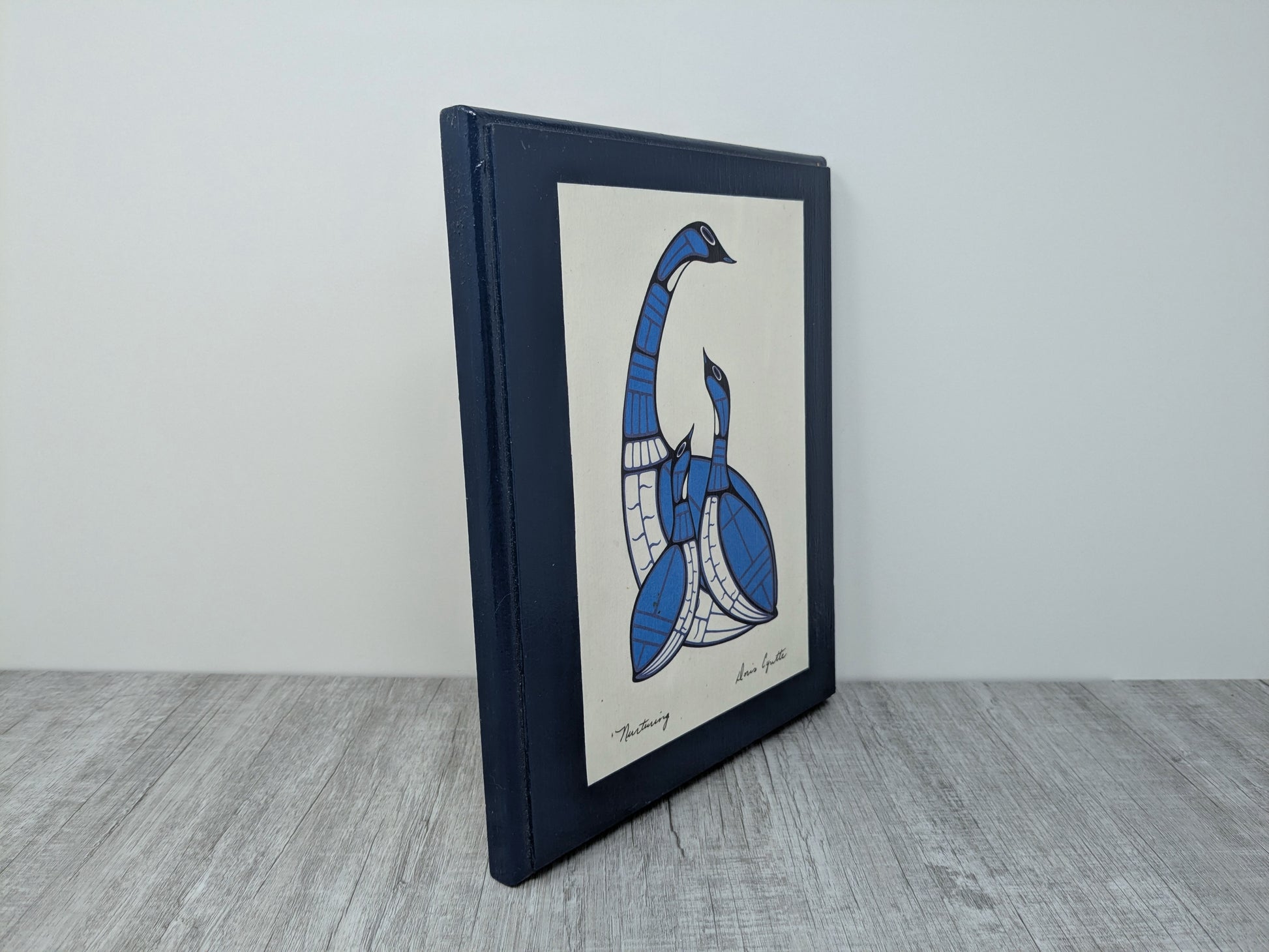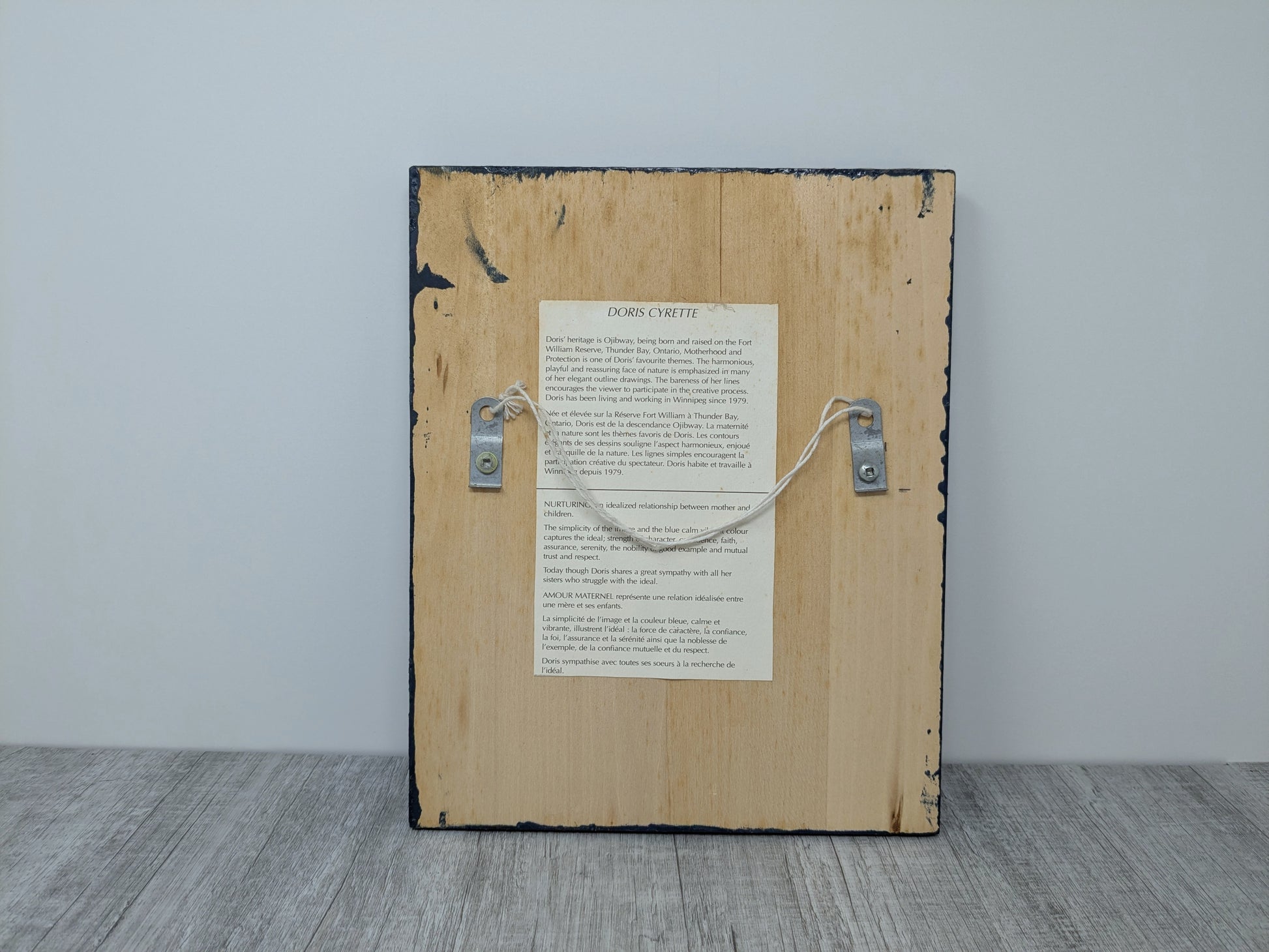 Art print by Ojibway artists Doris Cyrette "Nurturing" mounted and protected with a clear lacquer on a wood frame, . This is an attractive art print displayed in a unique style, the print is mounted on a painted wood plank which compliments the colour and aesthetics of the subject matter. Beautiful piece of woodland school of art by a renowned indigenous artist. Piece is clean with little wear and is ready to hang. Artist bio attached to back.