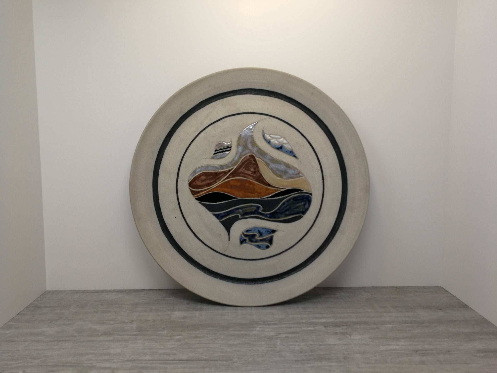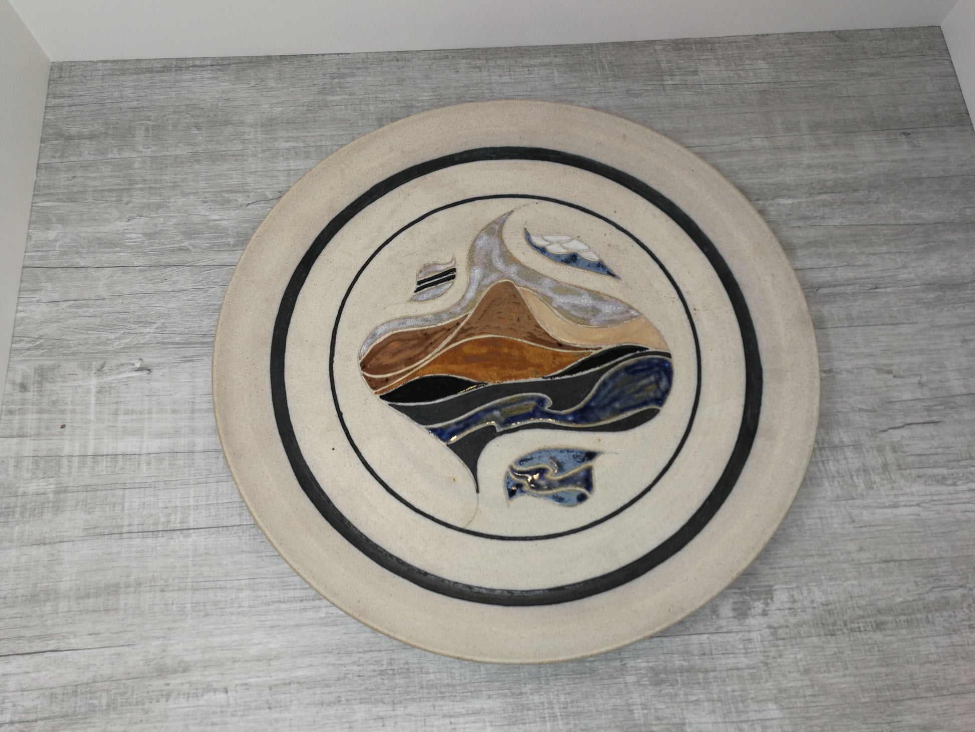 Fantastic large abstract West Coast landscape art pottery charger by artist / potter Henry Gottardi. Qualicum Beach, British Columbia