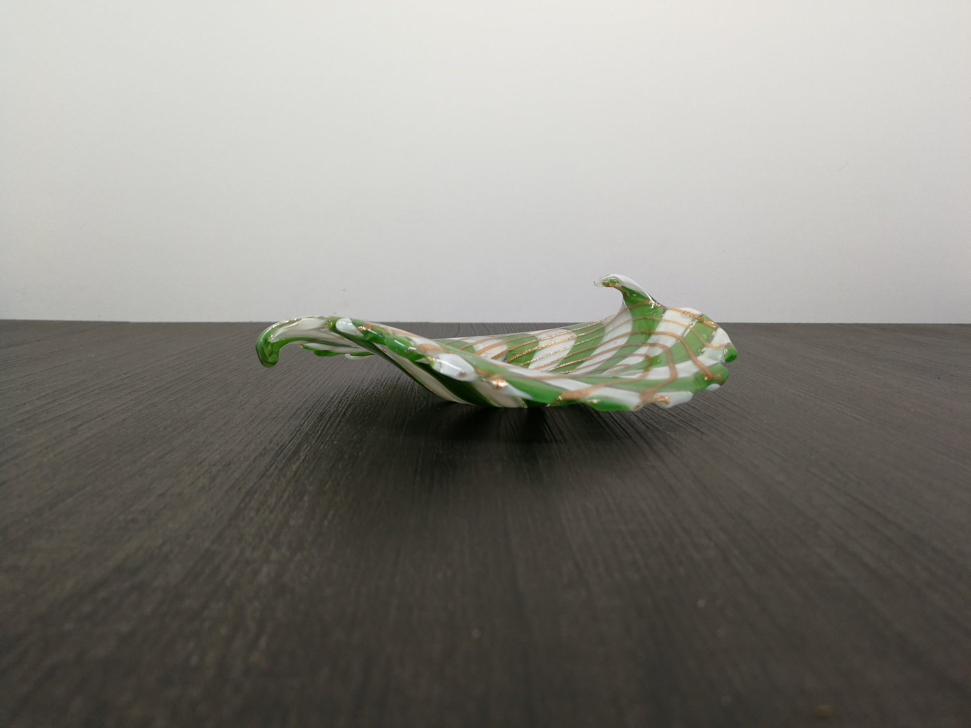 Italian art glass leaf shaped plate, green & white with gold filigree.