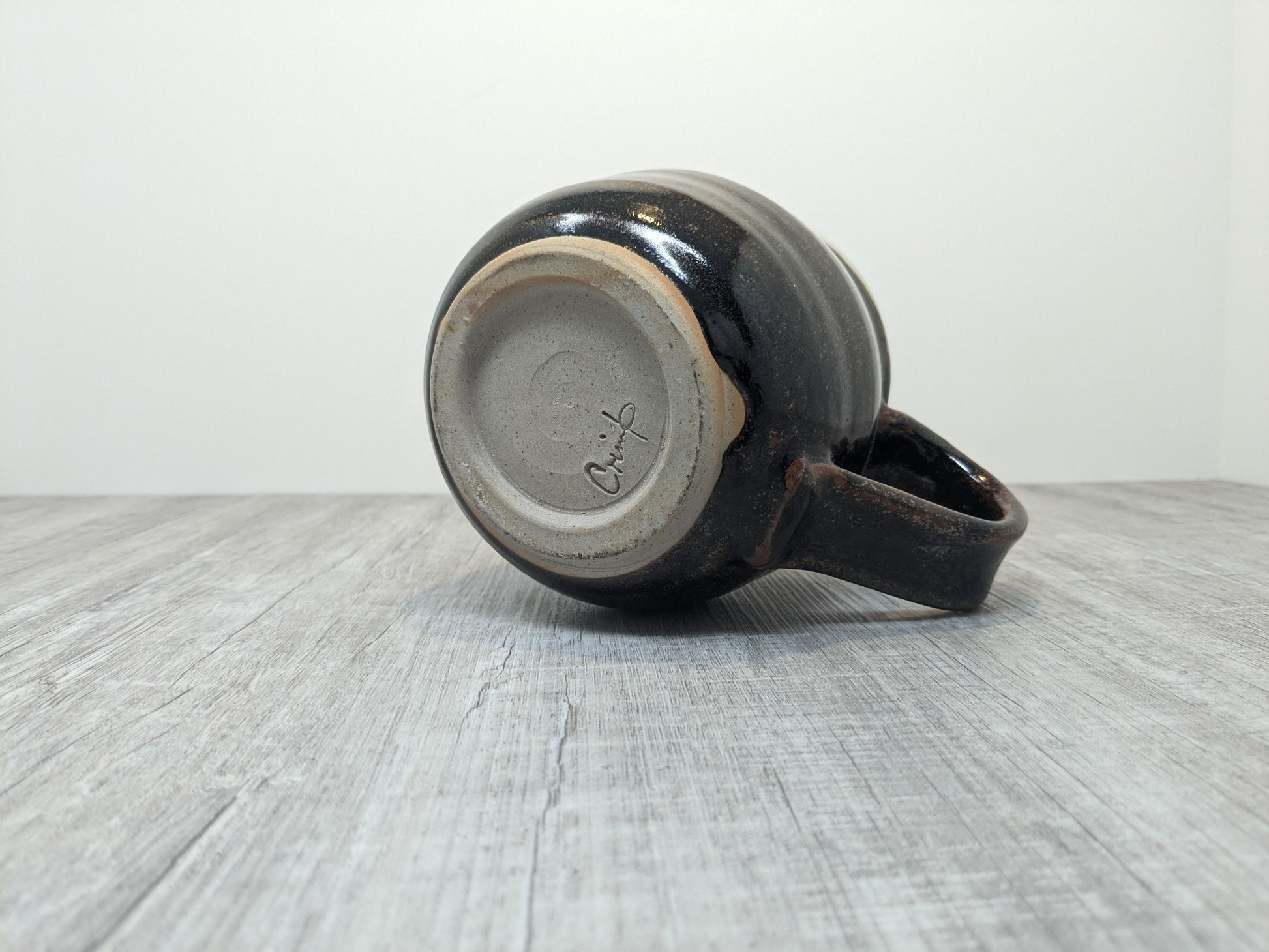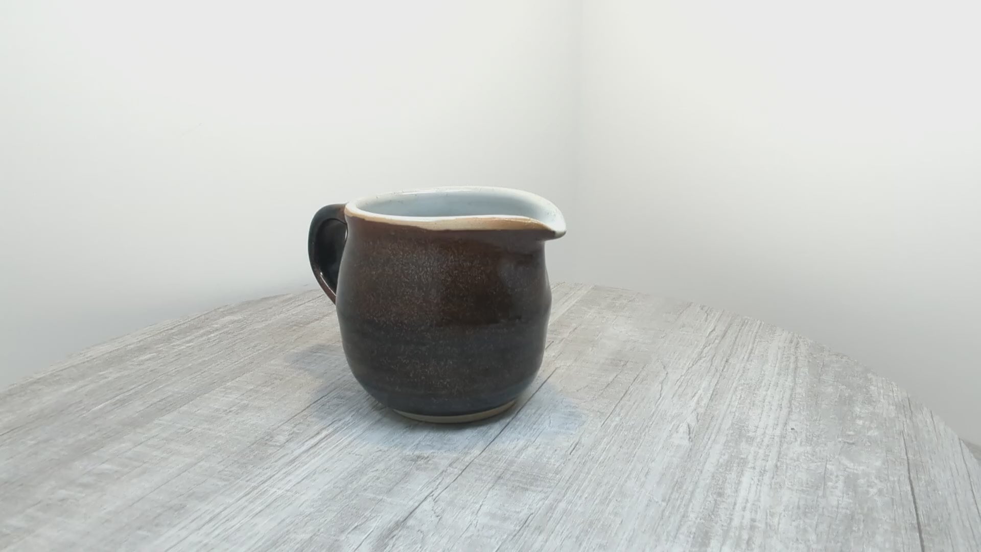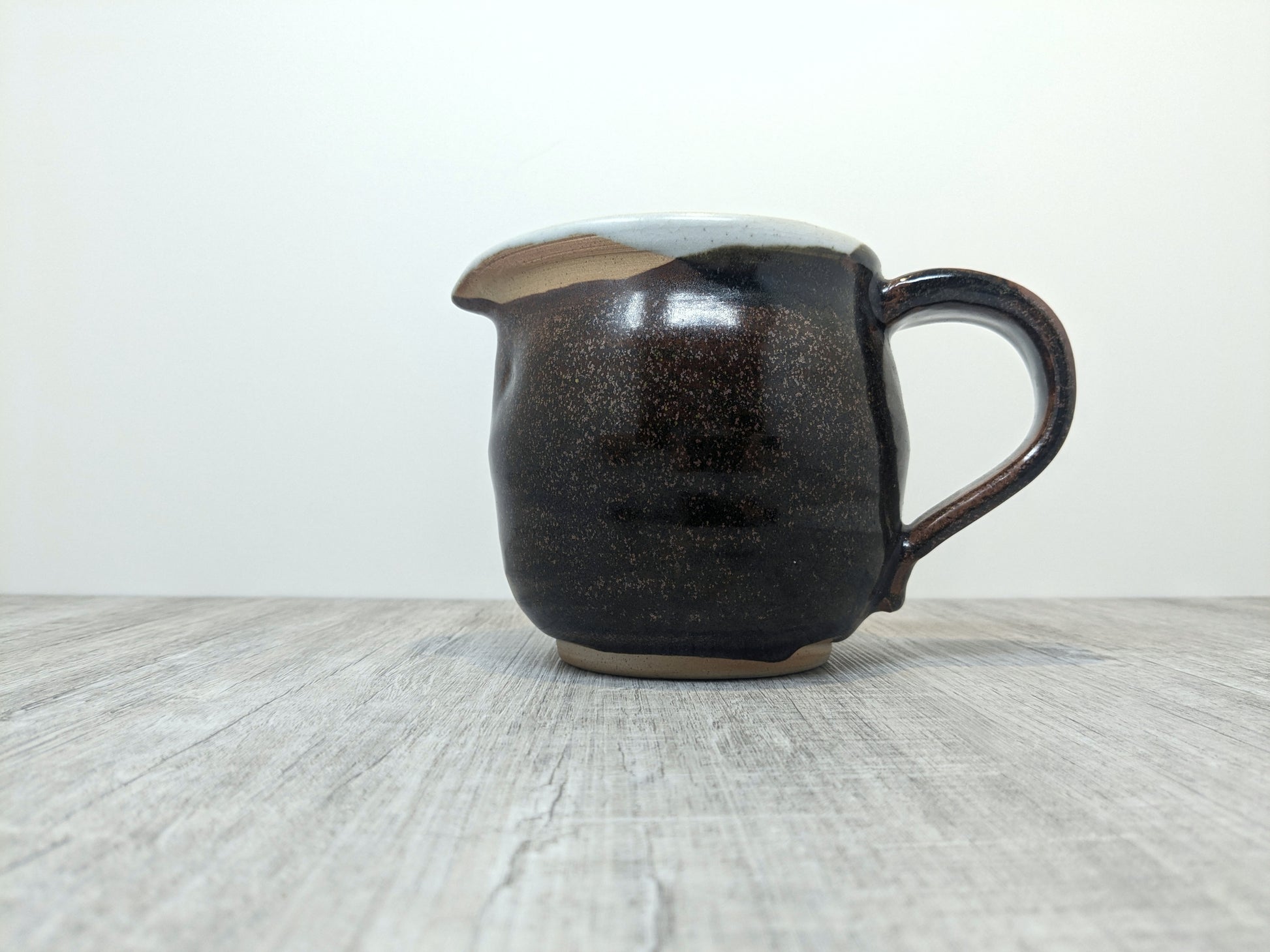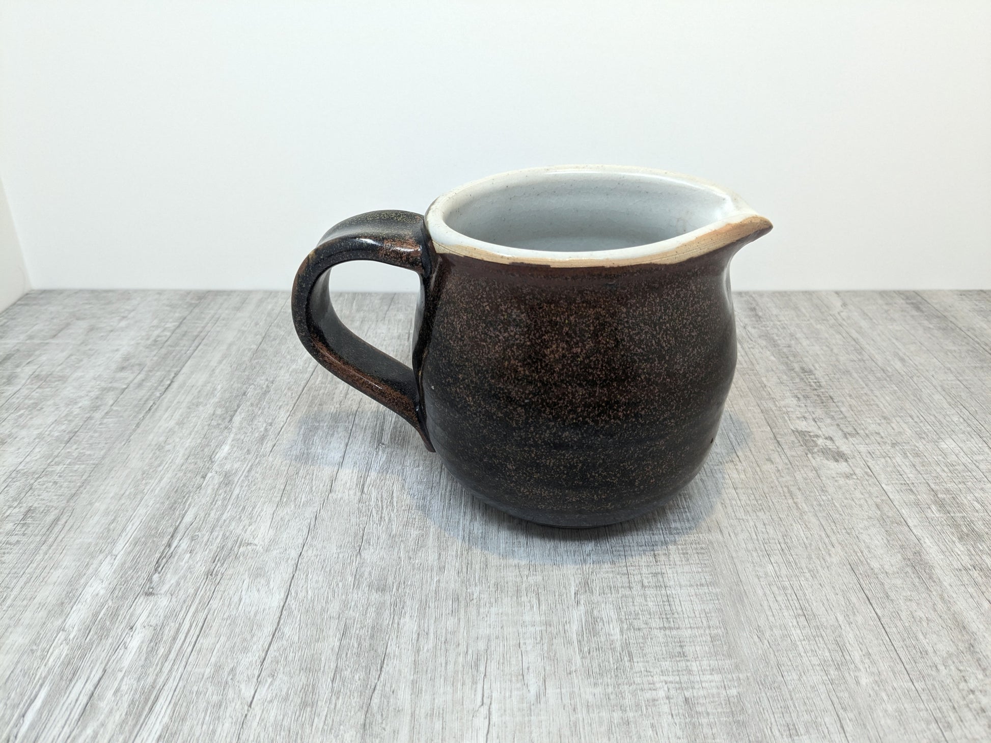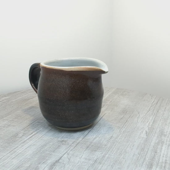 Beautiful stoneware medium sized jug with tenmoku glaze and white interior. Very sturdy practical jug made by Les Crimp (1928-2022) a Vancouver Island ceramist and a founding member of the Arrowsmith Potters Guild (founded 1995). His pottery is thrown with purpose with few embelishments, solid, rugged, refined with fantastic glaze application.