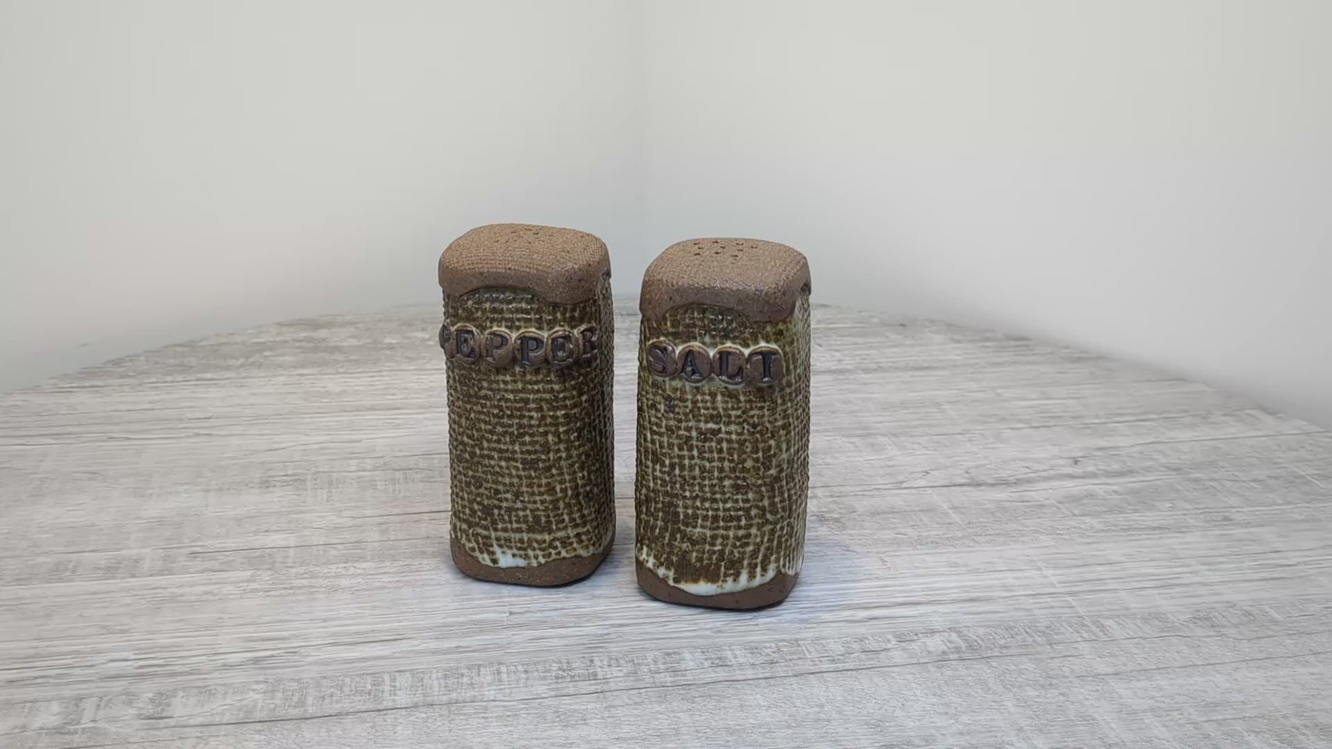 Linda Mackie Stoneware salt and pepper shakers from the 1970's. Well executed with lots of detailing. Shakers are in excellent condition and show little to no wear, comes with corks which fit snuggly.