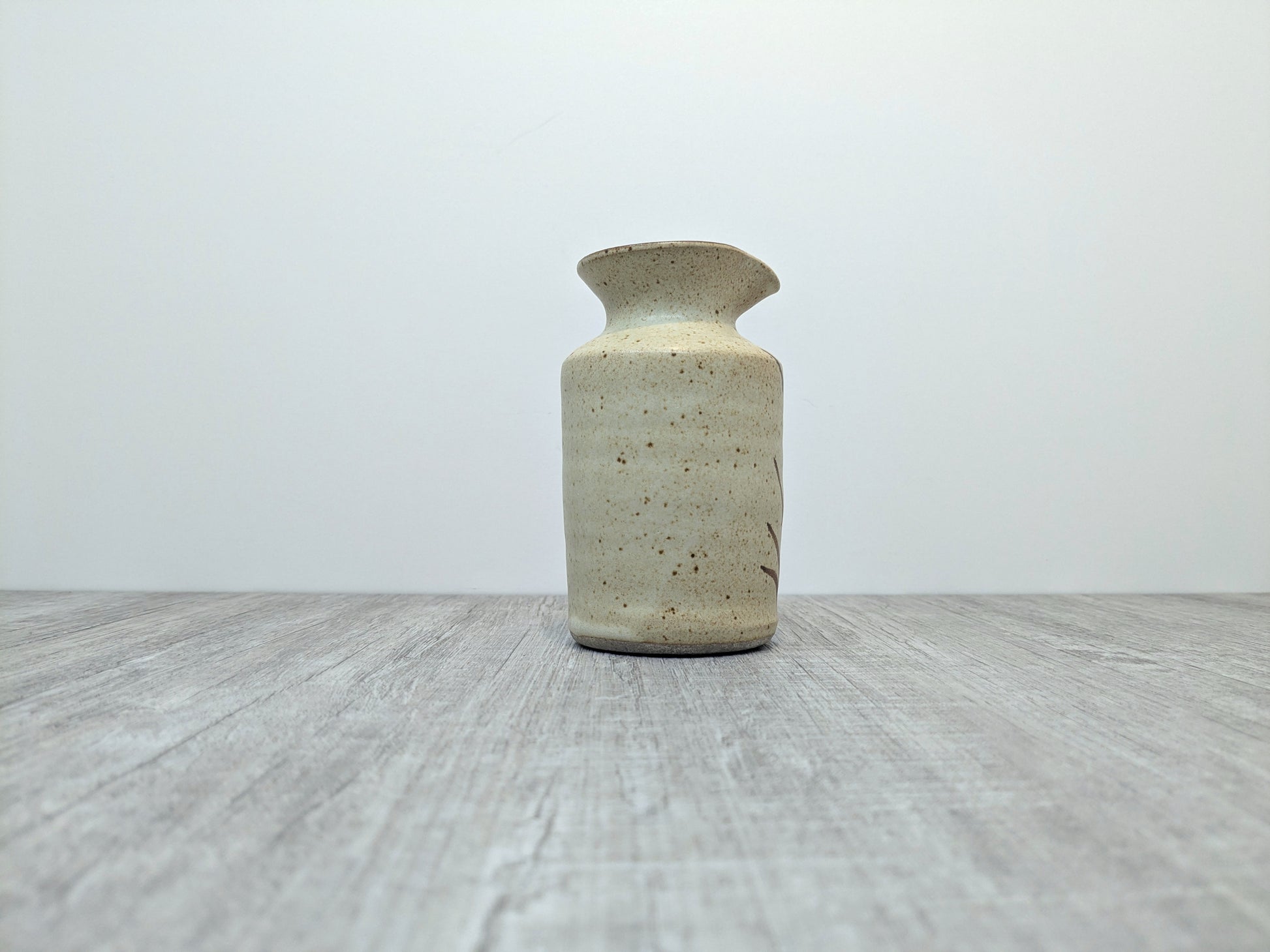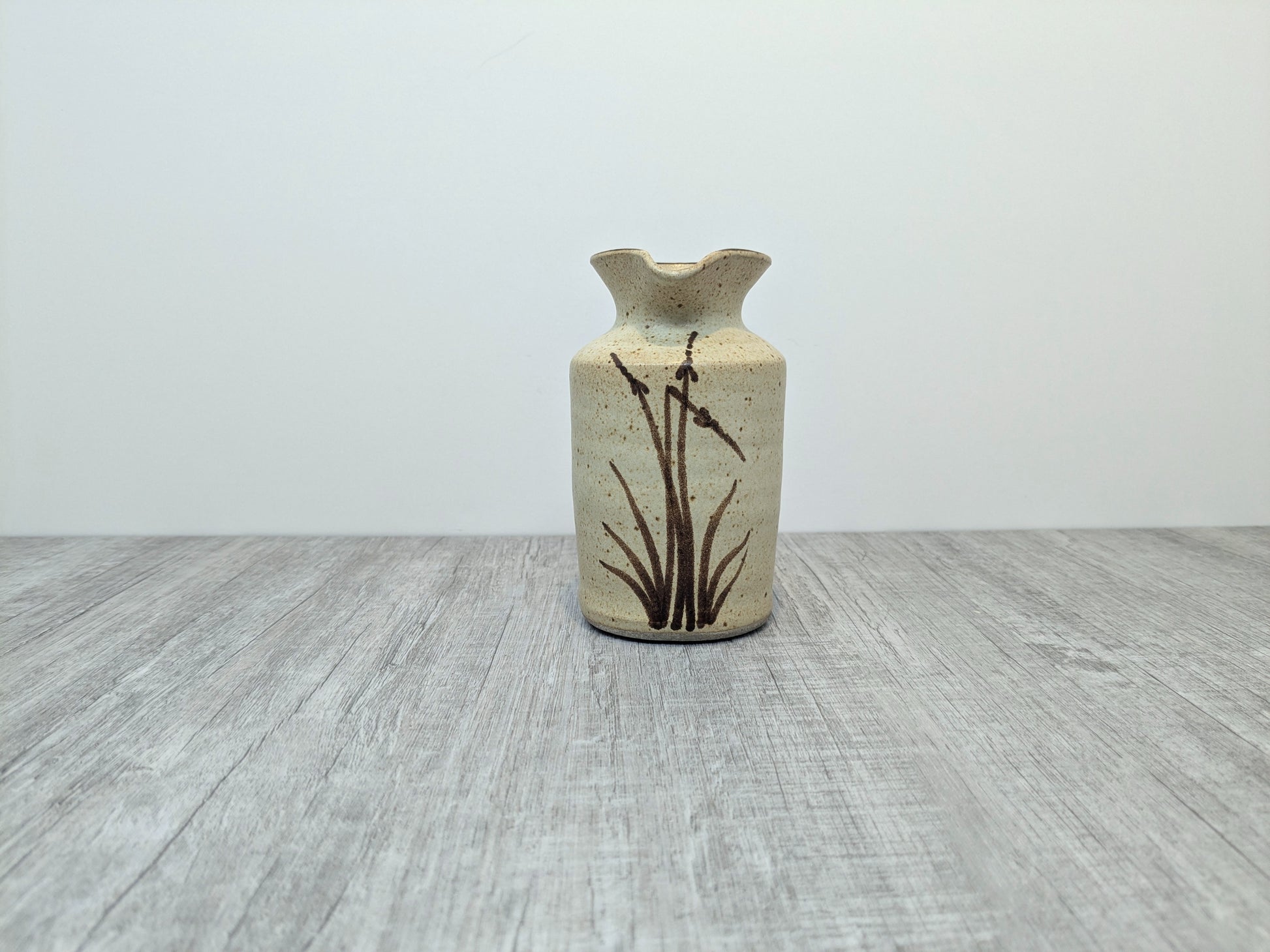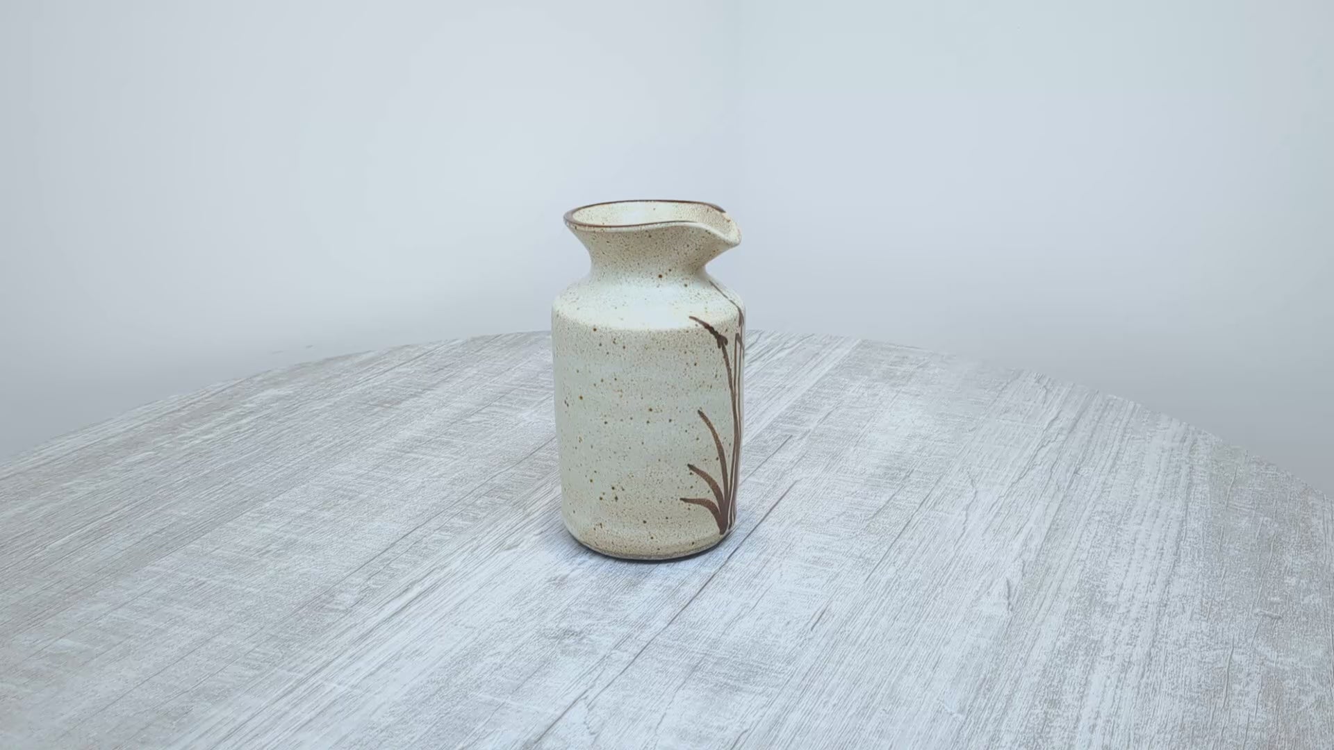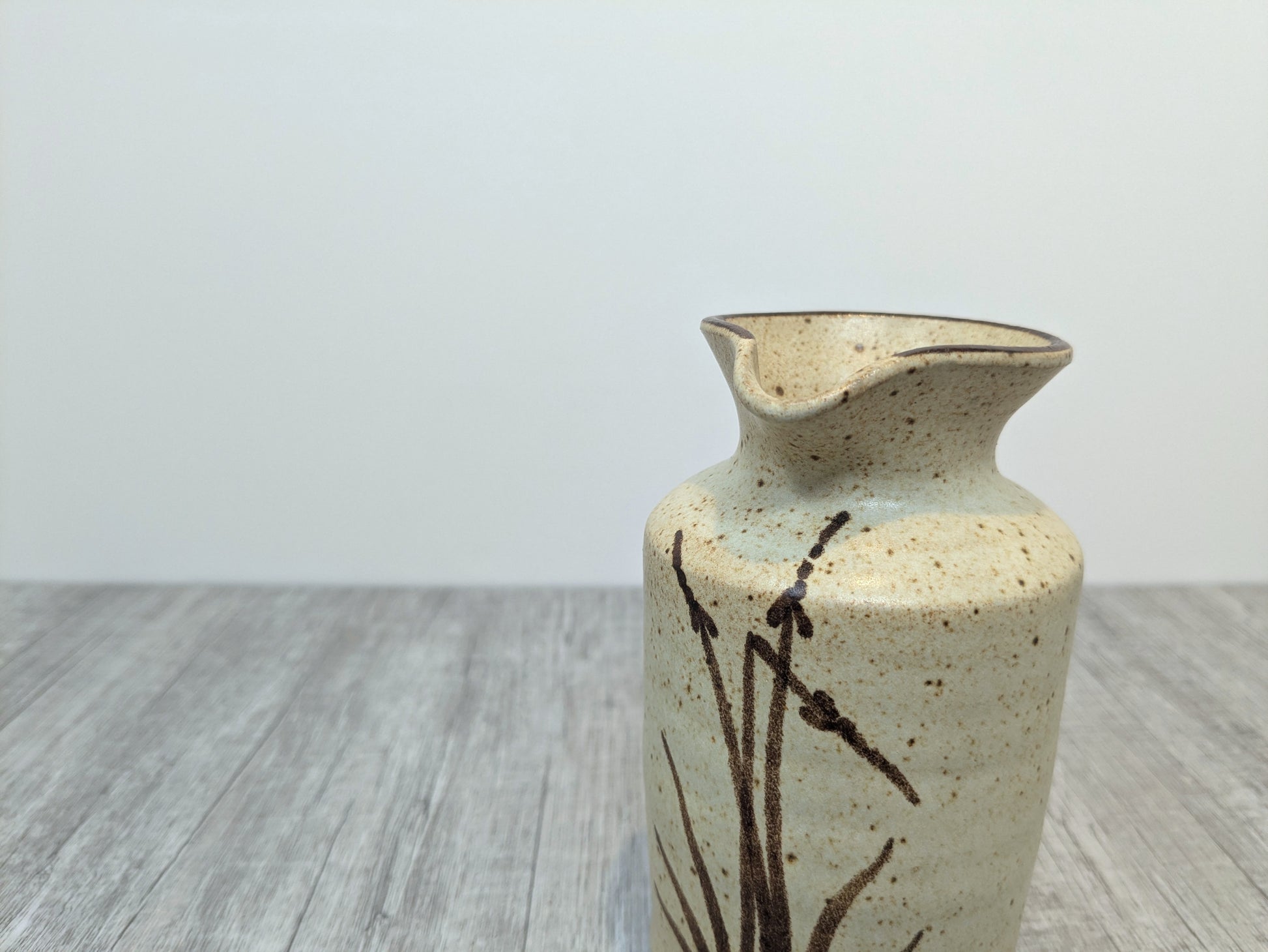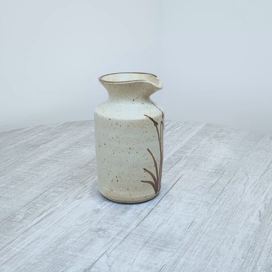Mary Fox Pottery Stoneware spouted pouring vessel or small vase. foxtail design brushstrokes in brown. Vessel is unmarked but has ubiquitous design pattern from that time. This is a beutiful, finely made little vessel, likely had a cork when first produced.
