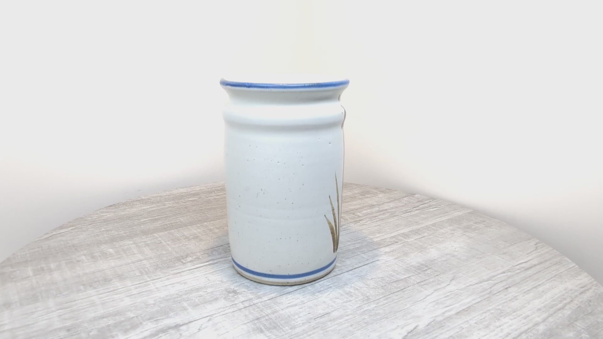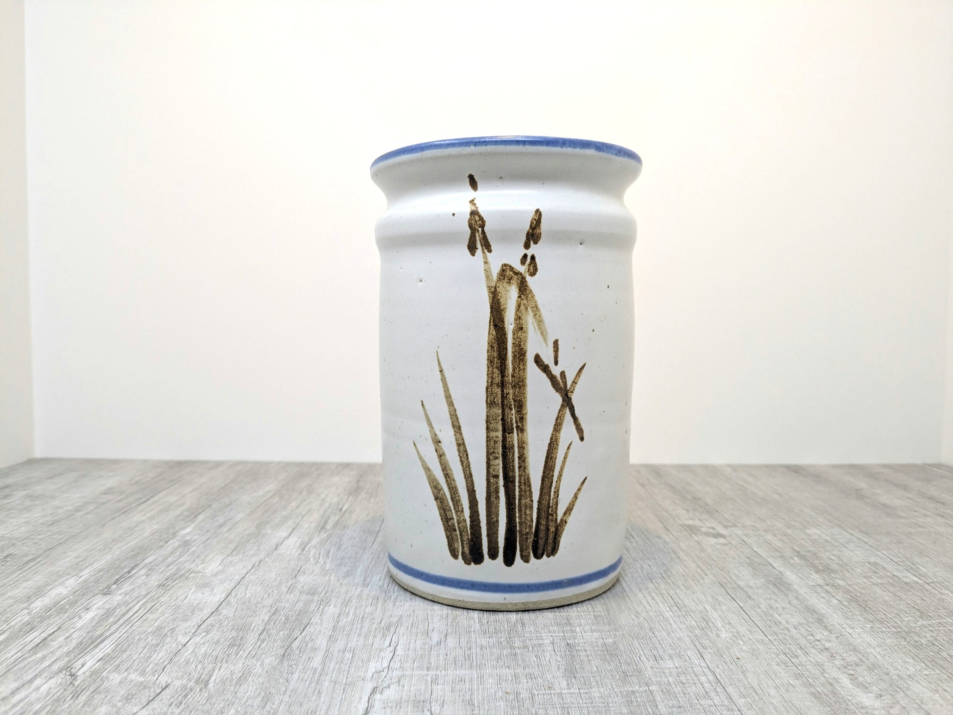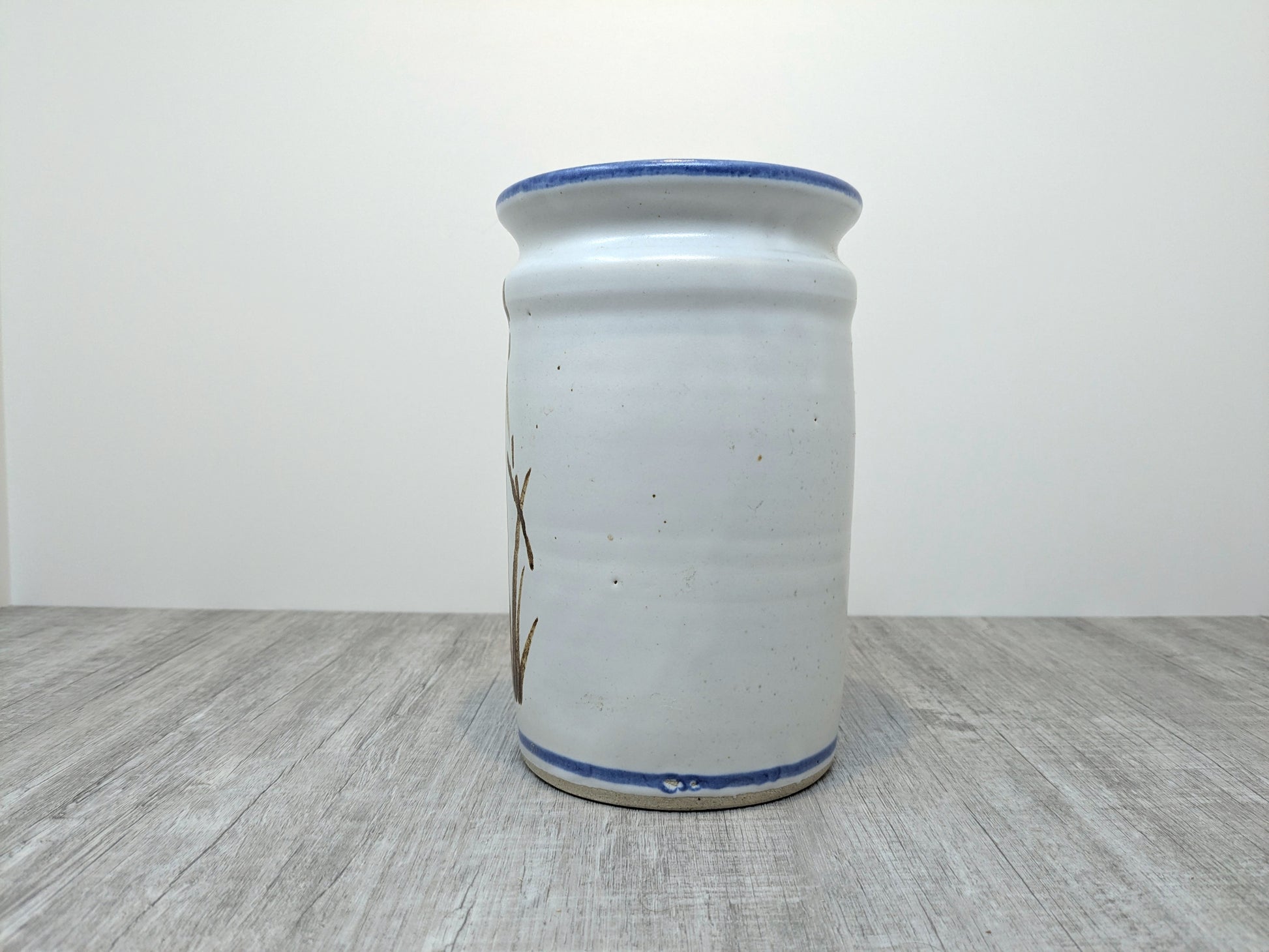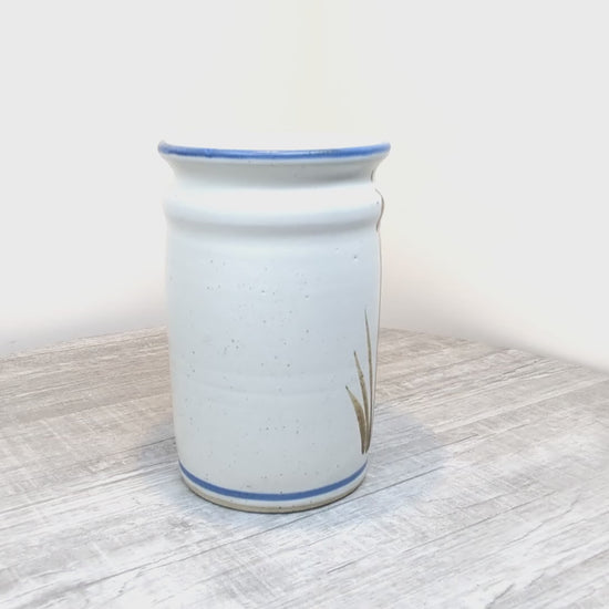 Mary Fox Pottery Stoneware tall cylinder Utensil Holder / Vase, foxtail design brushstrokes in brown with blue trim highlights, very sturdy.