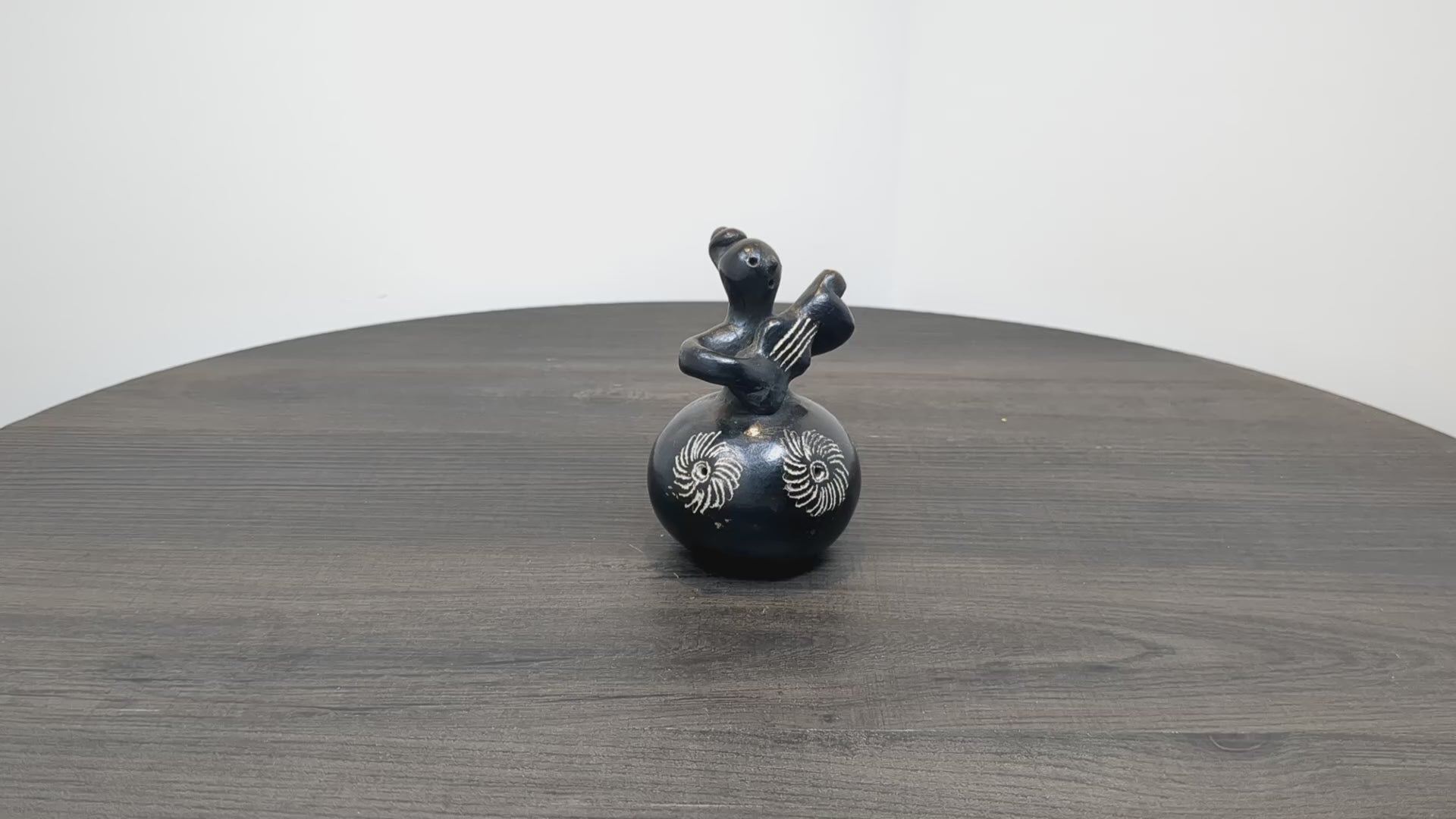 A beautiful piece of Quinchamali pottery of a Barro Negro Guitar Player female musician. Quinchimali pottery is characterized by its black glaze with white etched accents, this traditional pottery dates back centuries within the mestizo cultural tradition of central Chile.