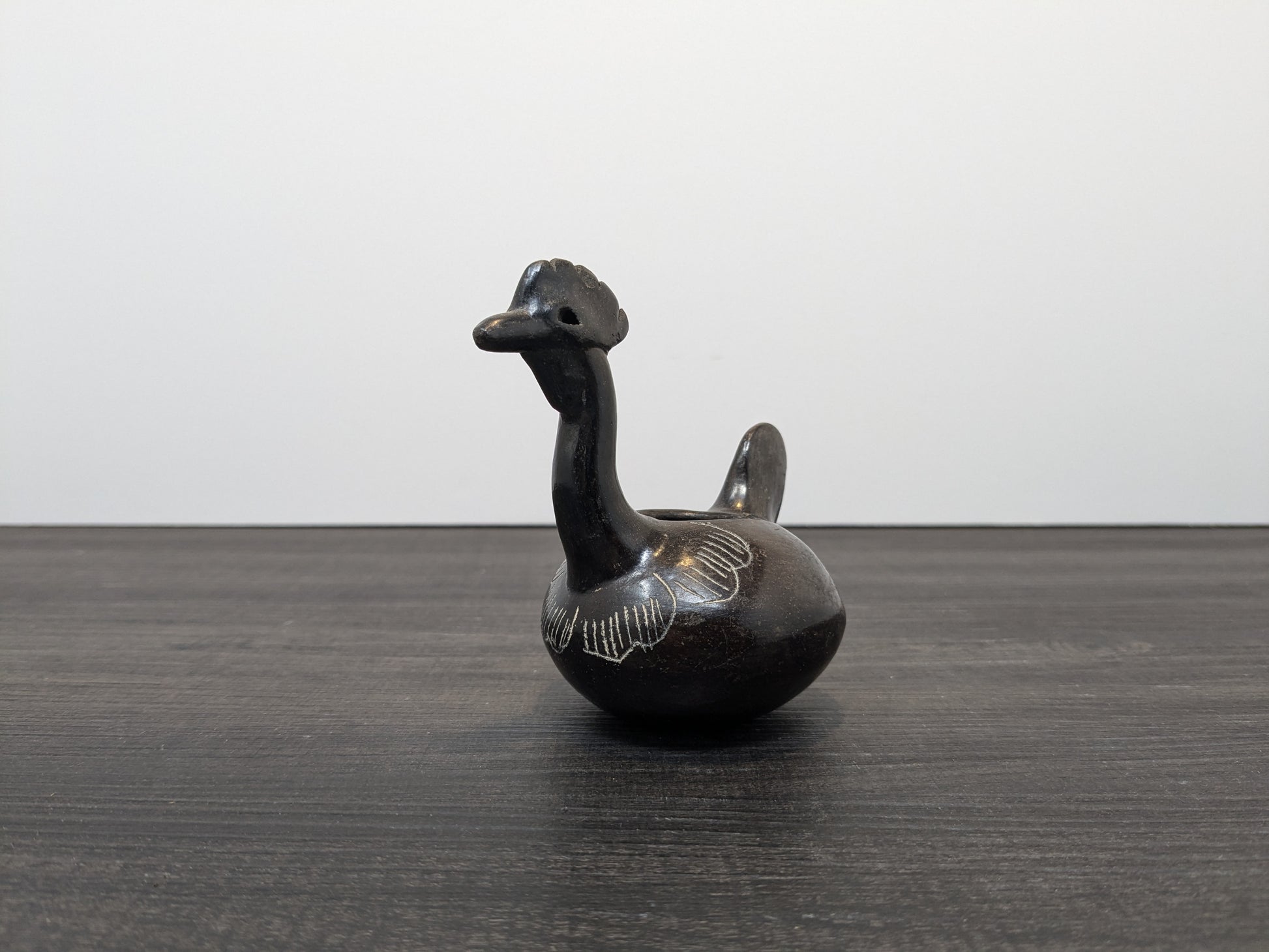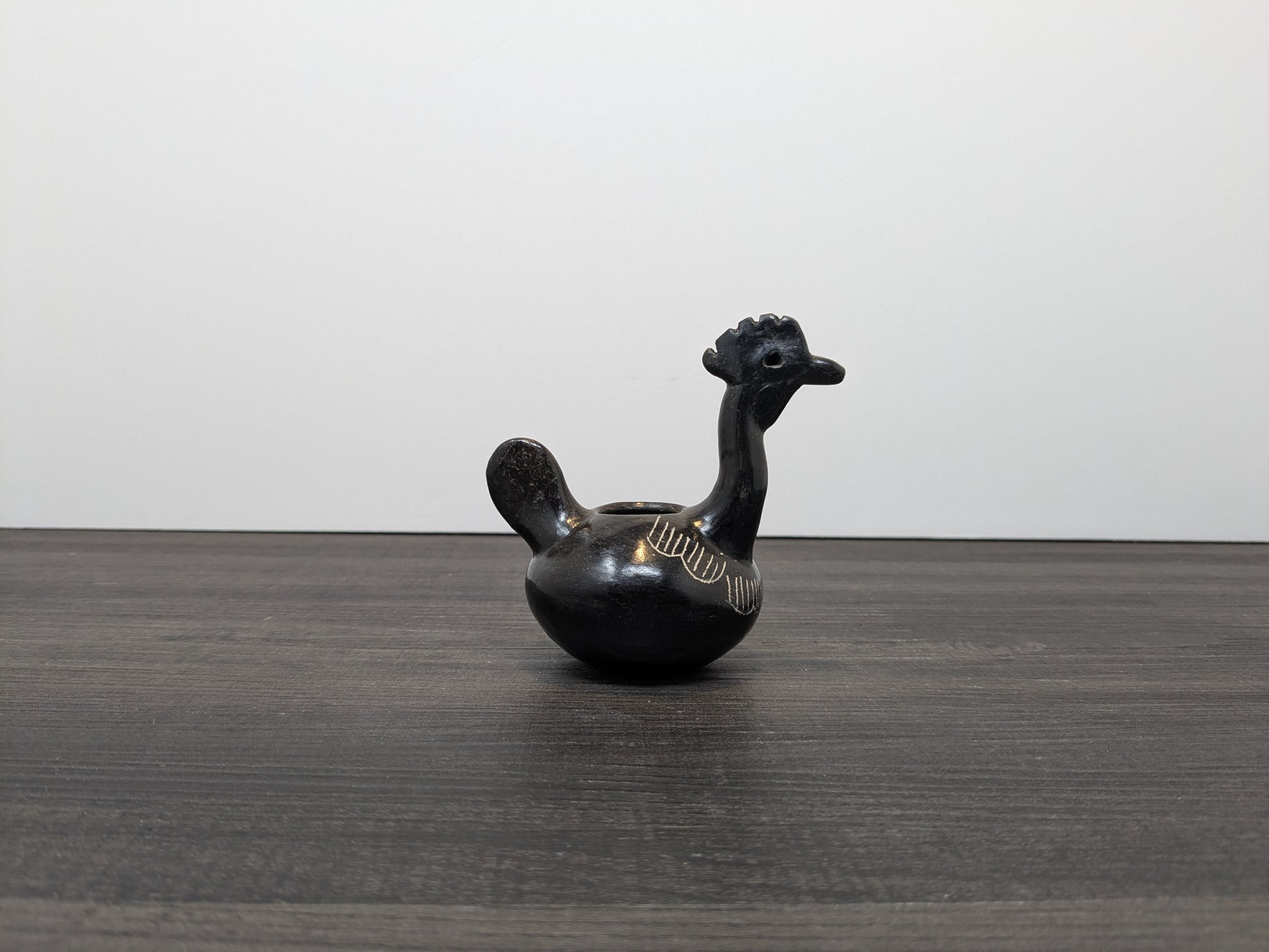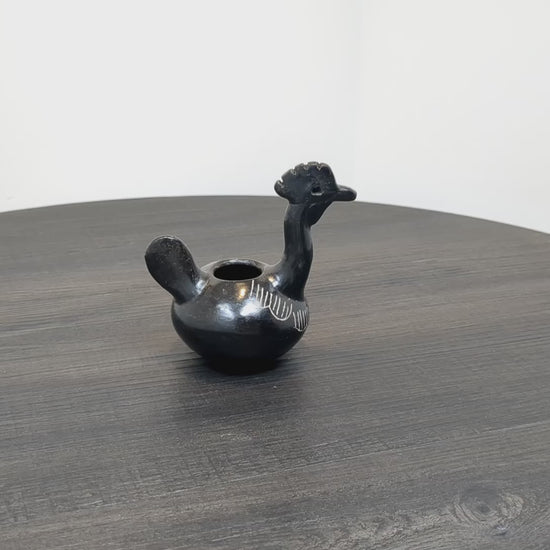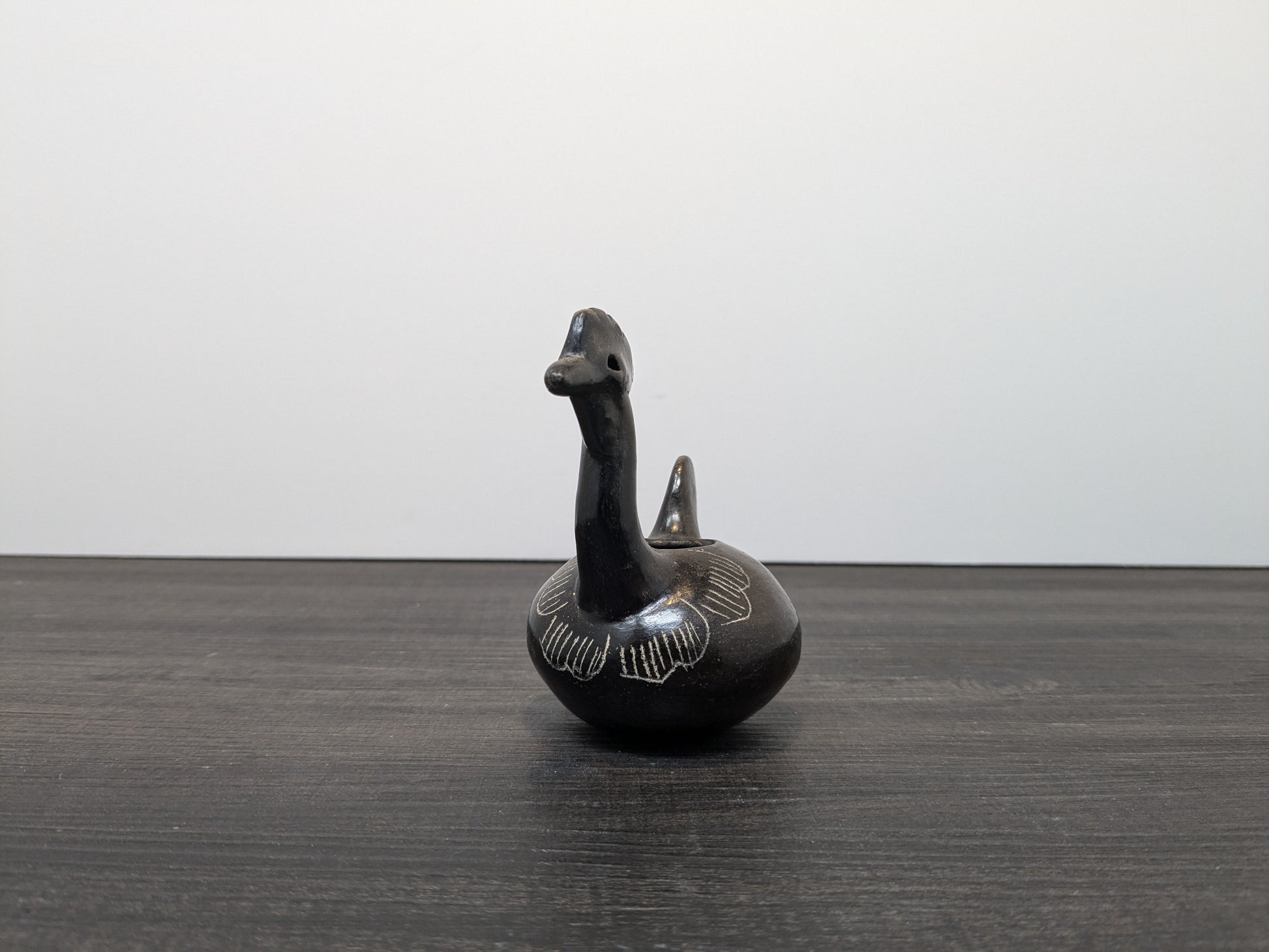 A beautiful piece of Quinchamali pottery depicting a rooster. Quinchimali pottery is characterized by its black glaze with white etched accents, this traditional pottery dates back centuries within the Mestizo cultural tradition of central Chile.