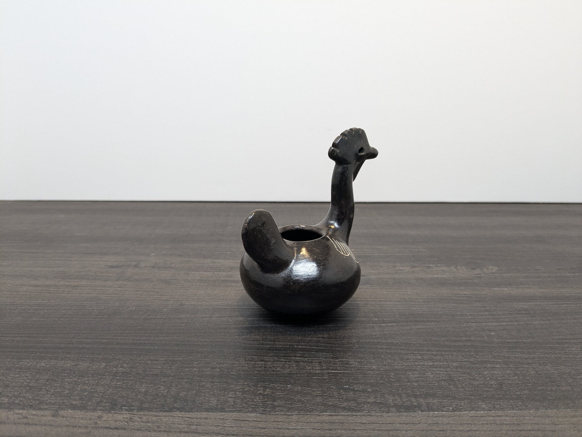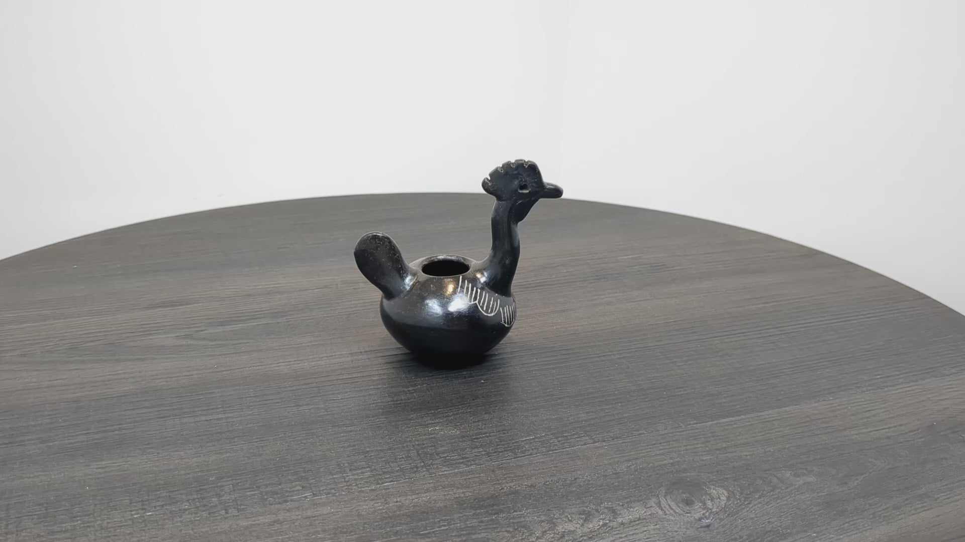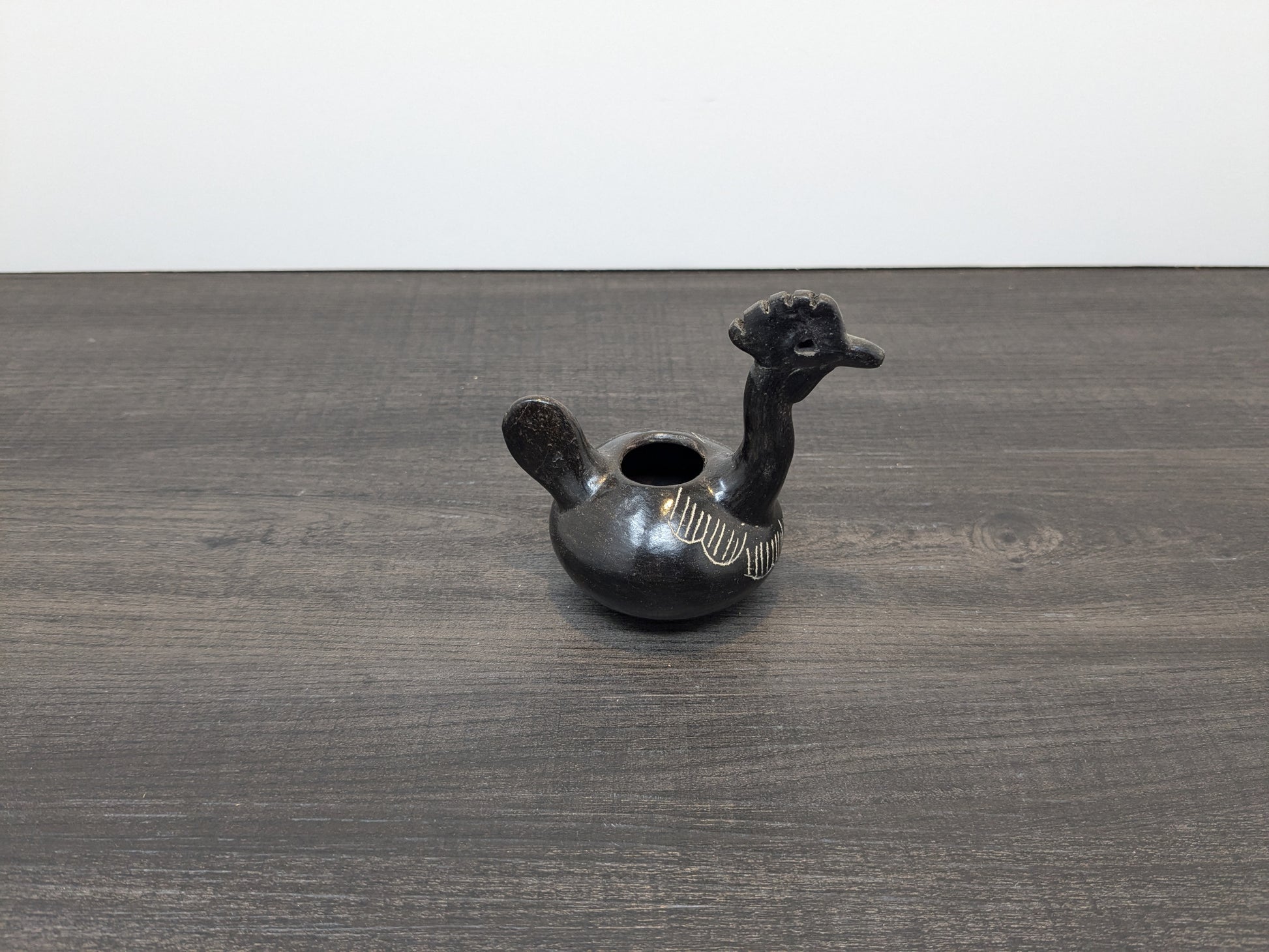 A beautiful piece of Quinchamali pottery depicting a rooster. Quinchimali pottery is characterized by its black glaze with white etched accents, this traditional pottery dates back centuries within the Mestizo cultural tradition of central Chile.
