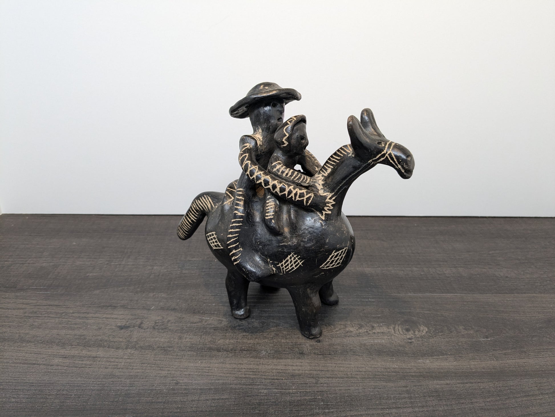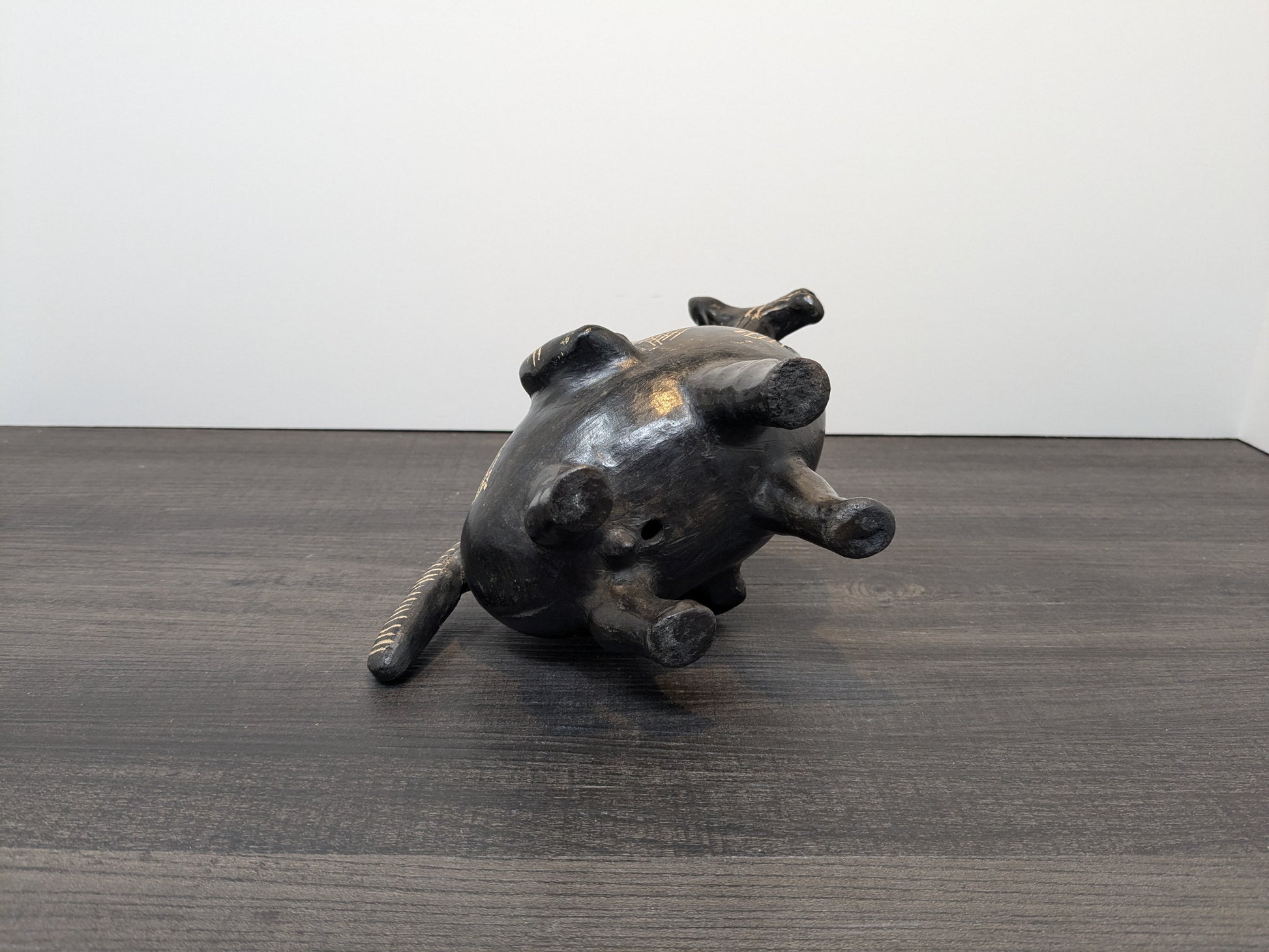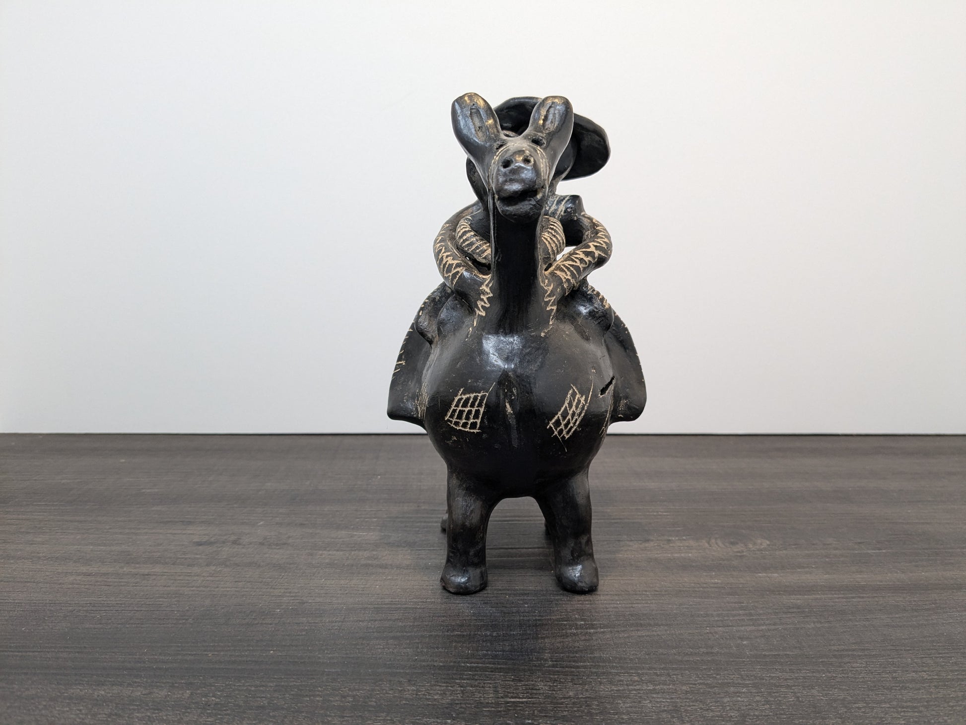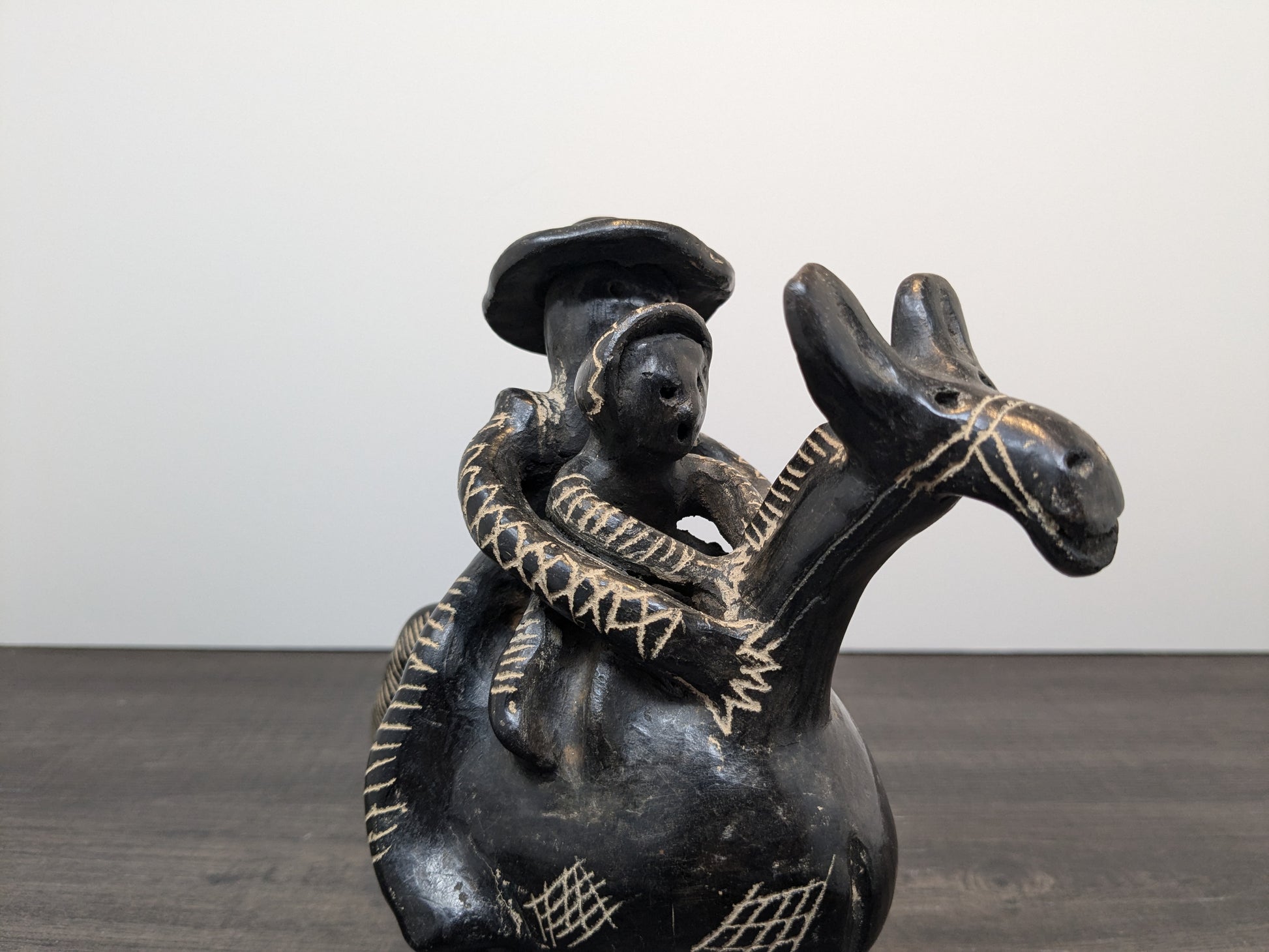 A beautiful piece of Quinchamali pottery from the 1950's-60's attributed to Práxedes Caro who is considered one of the most important artists in the history of Quinchamali art of the 20th century. Quinchimali pottery is characterized by its black glaze with white etched accents, this traditional pottery dates back centuries within the mestizo cultural tradition of central Chile.