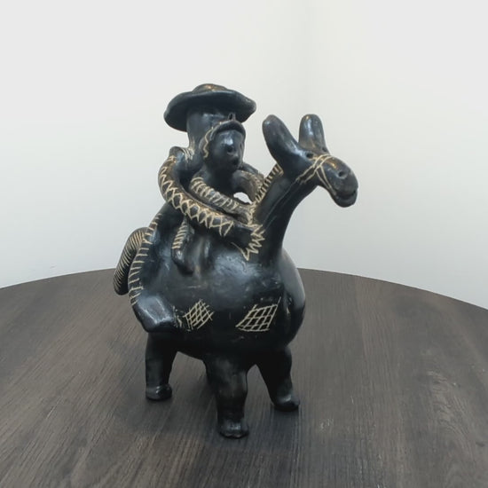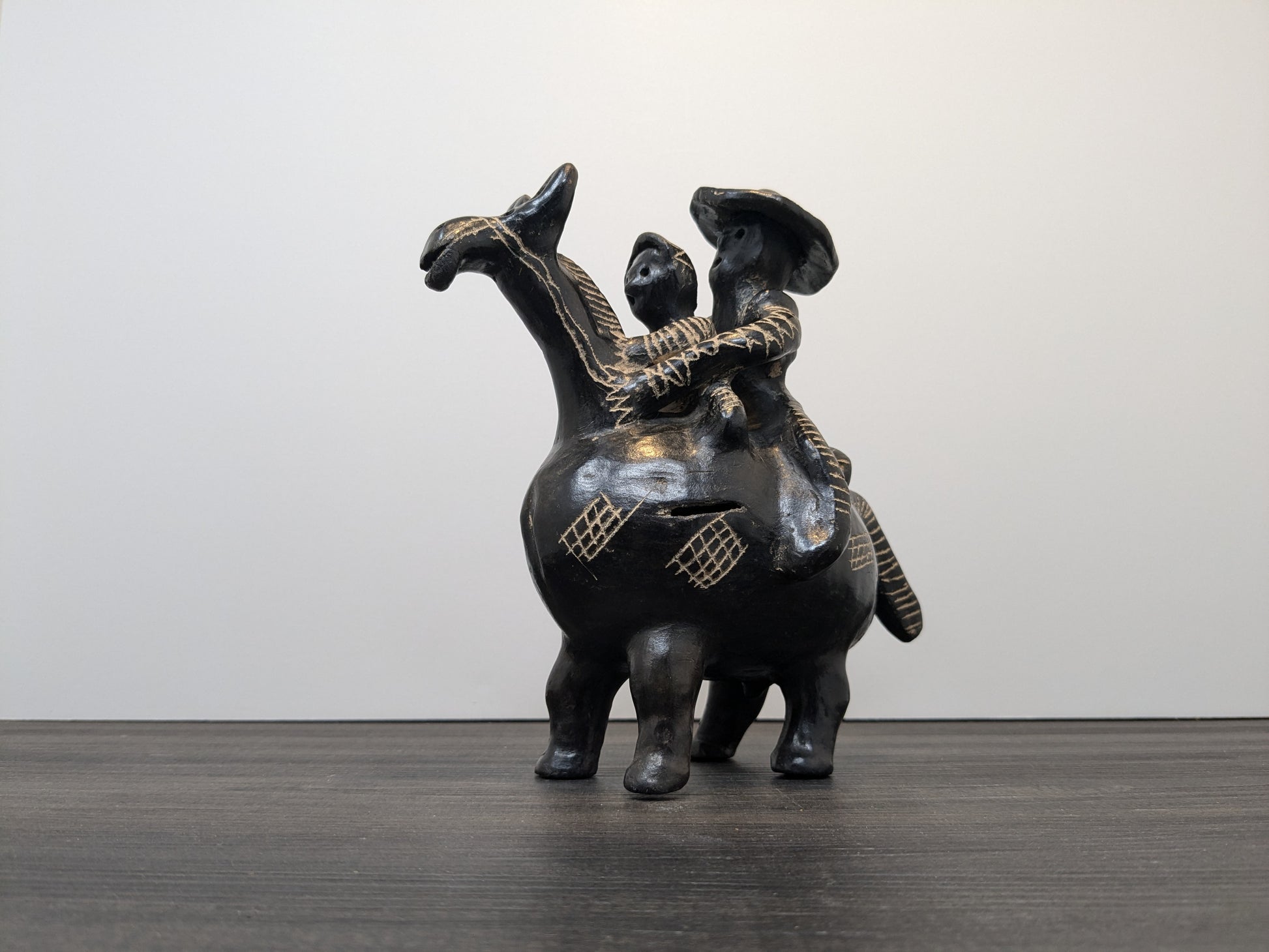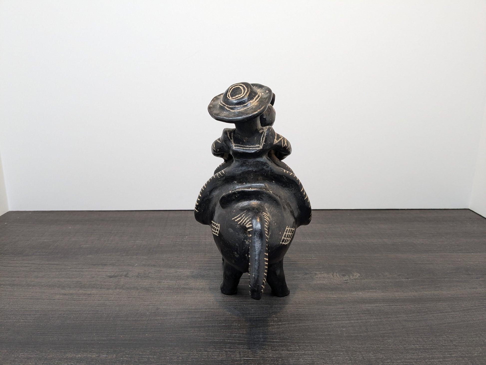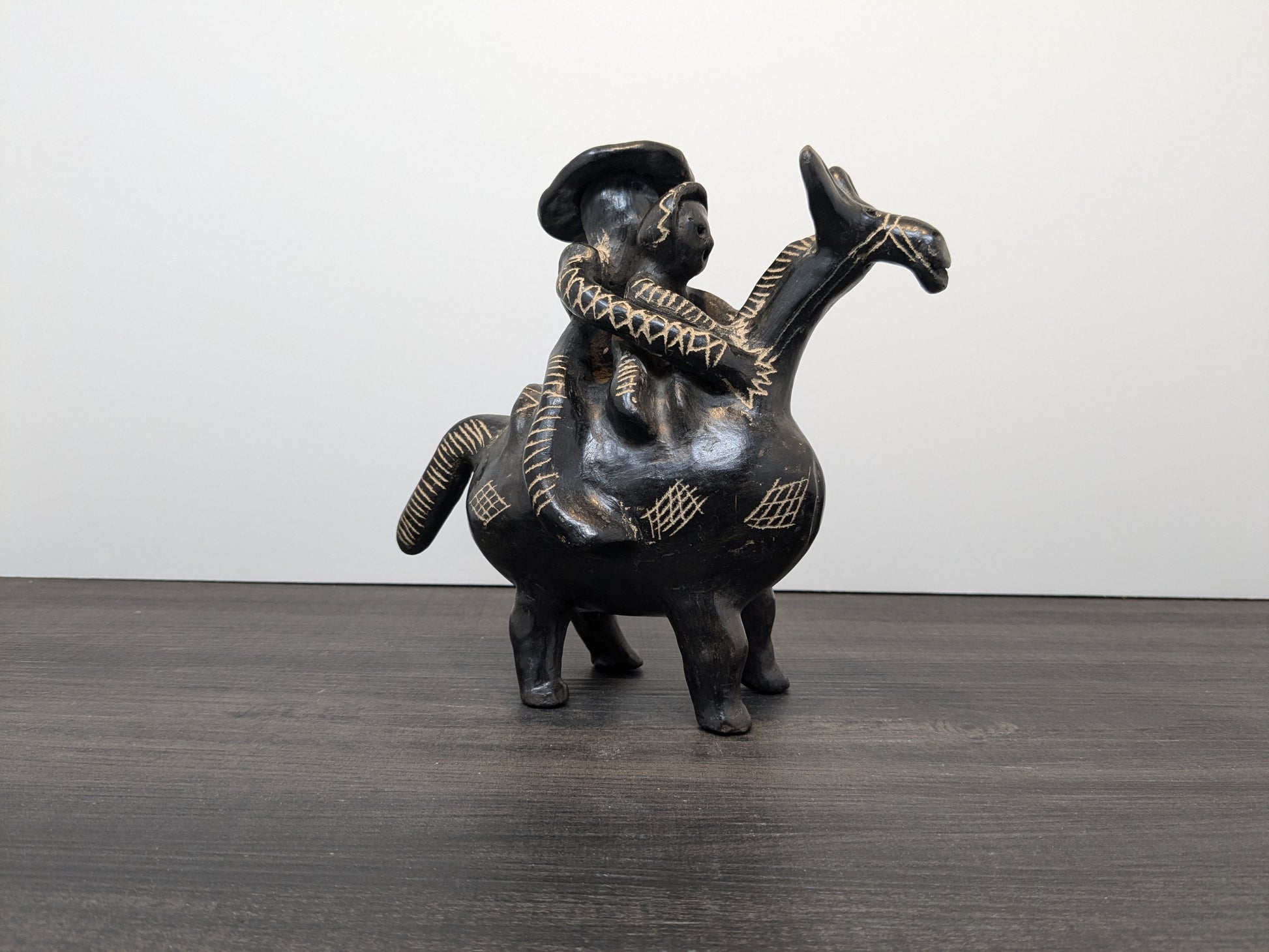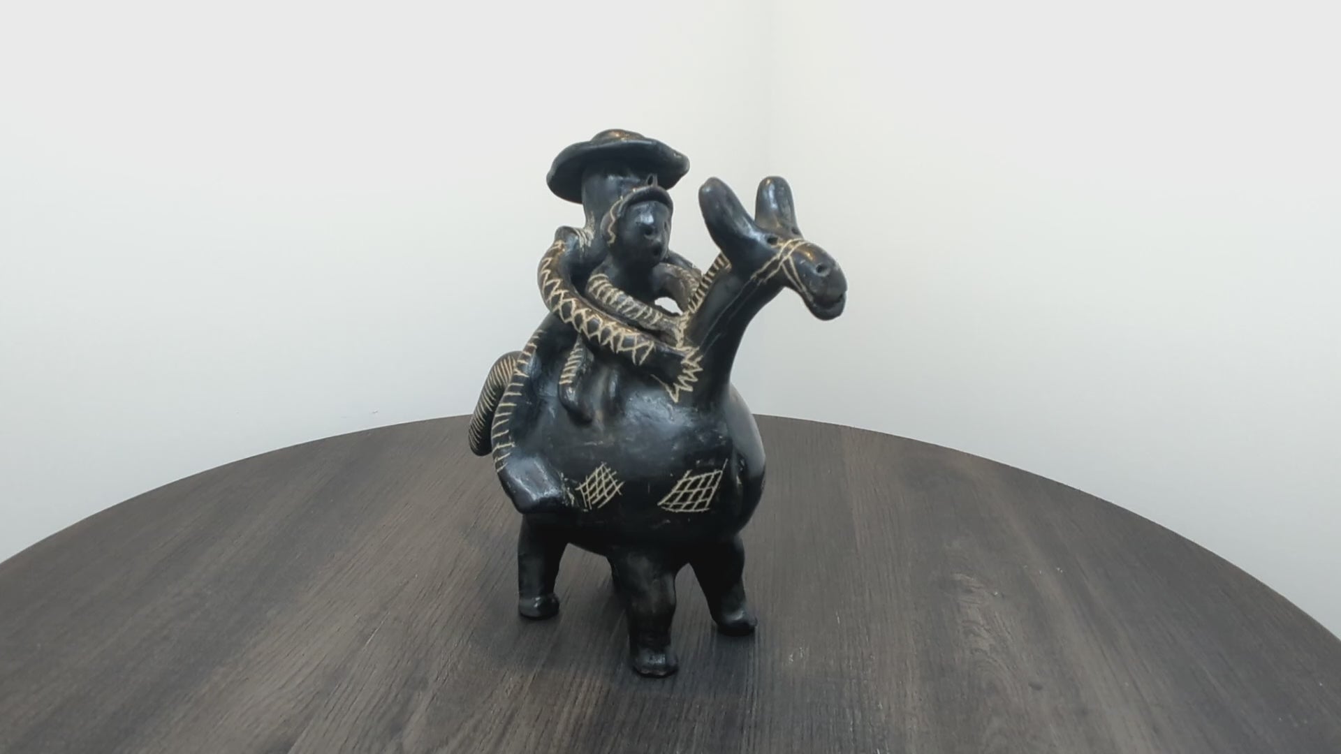 A beautiful piece of Quinchamali pottery from the 1950's-60's attributed to Práxedes Caro who is considered one of the most important artists in the history of Quinchamali art of the 20th century. Quinchimali pottery is characterized by its black glaze with white etched accents, this traditional pottery dates back centuries within the mestizo cultural tradition of central Chile.