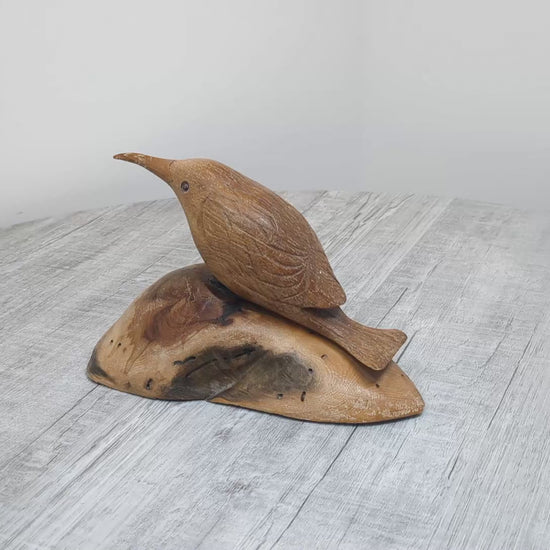 Another Finely detailed piece of vintage folk art by Red Fairhall (1926-2001) , hand carved bird of a Red Tree Creeper which is mounted on a cedar pedestal. Red Fairhall was a Vancouver Island wood carver located in Sydney BC. He carved many different bird species for friends and the local tourist market, they are finely carved with subtle details. Base is marked by artist " Red Tree Creeper in Cedar" with artists name. Piece is in very good vintage condition with no chips or cracks, piece is structurally sound with original patina. Has some scratch marks to beak.