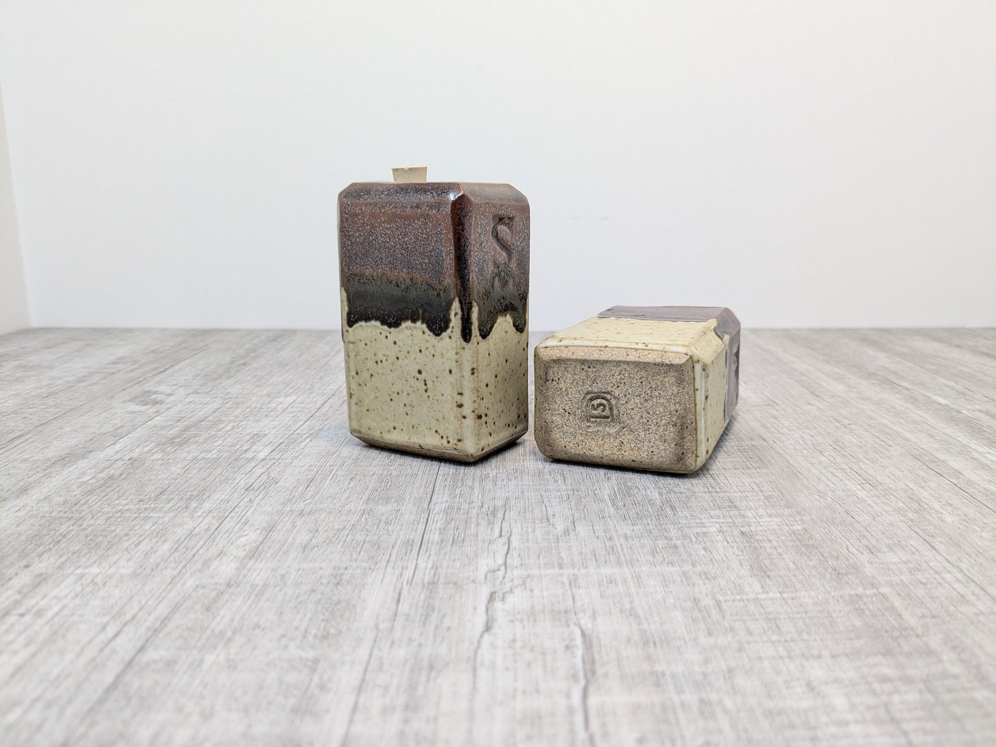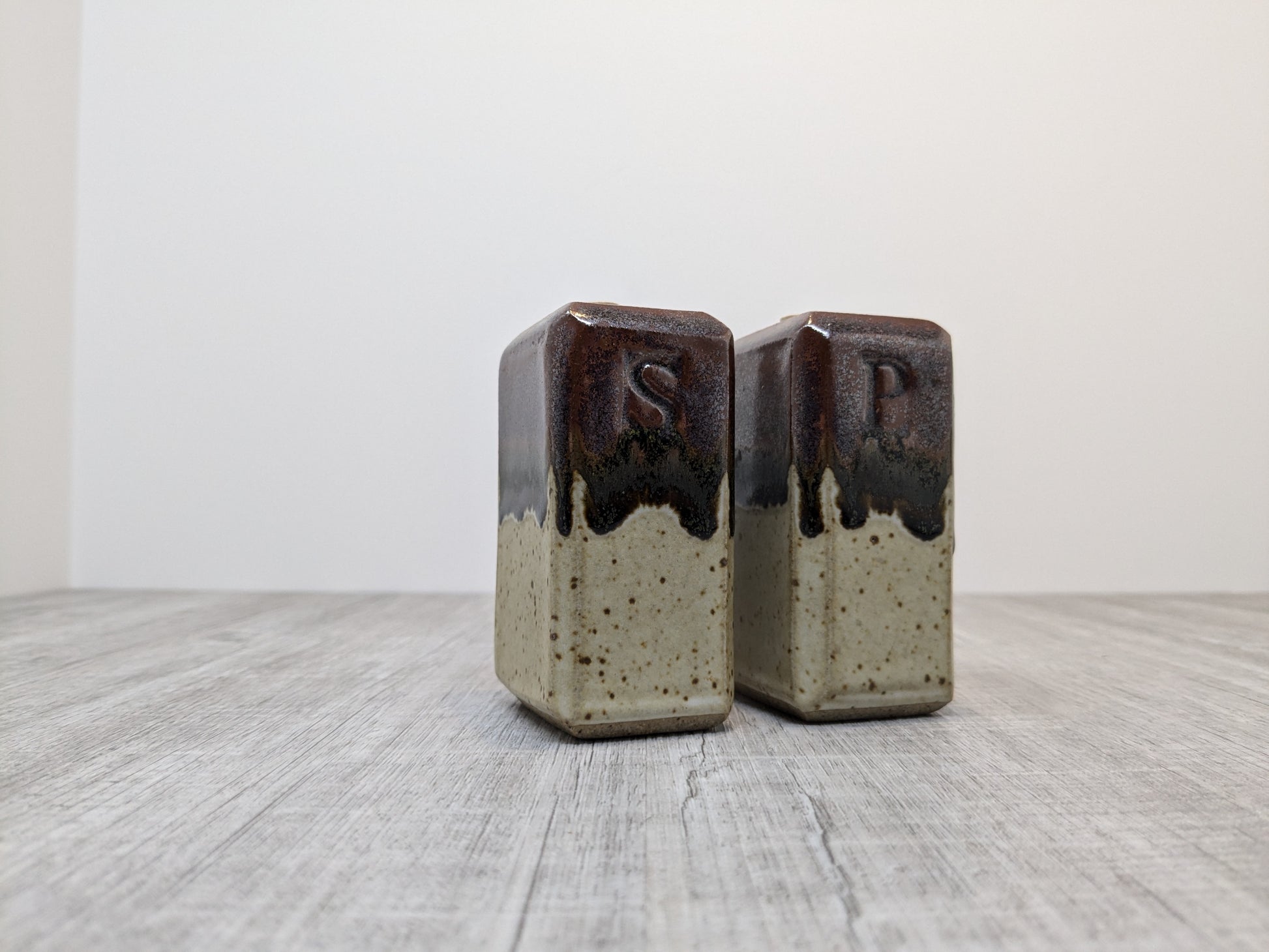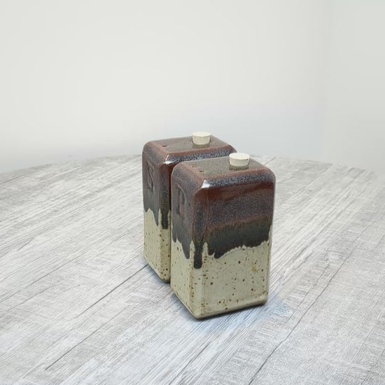 Hand built Rectangular salt and pepper shakers. Oatmeal and Tenmoku drip glaze.