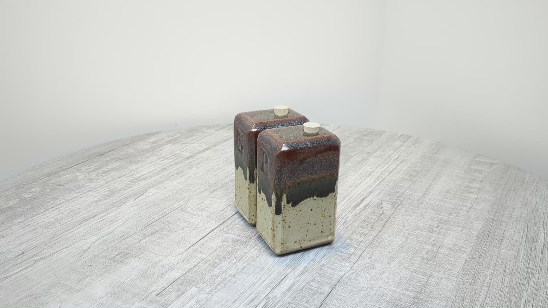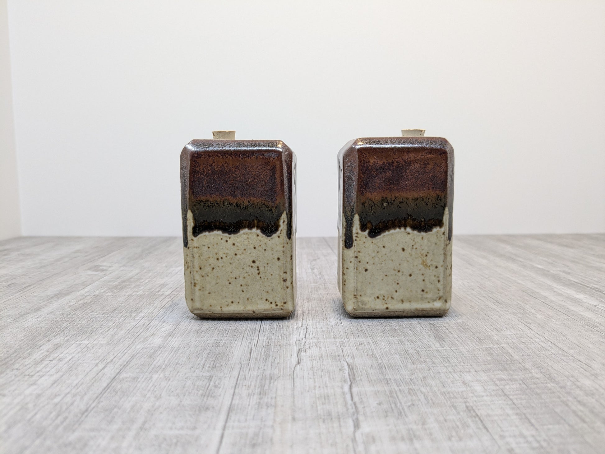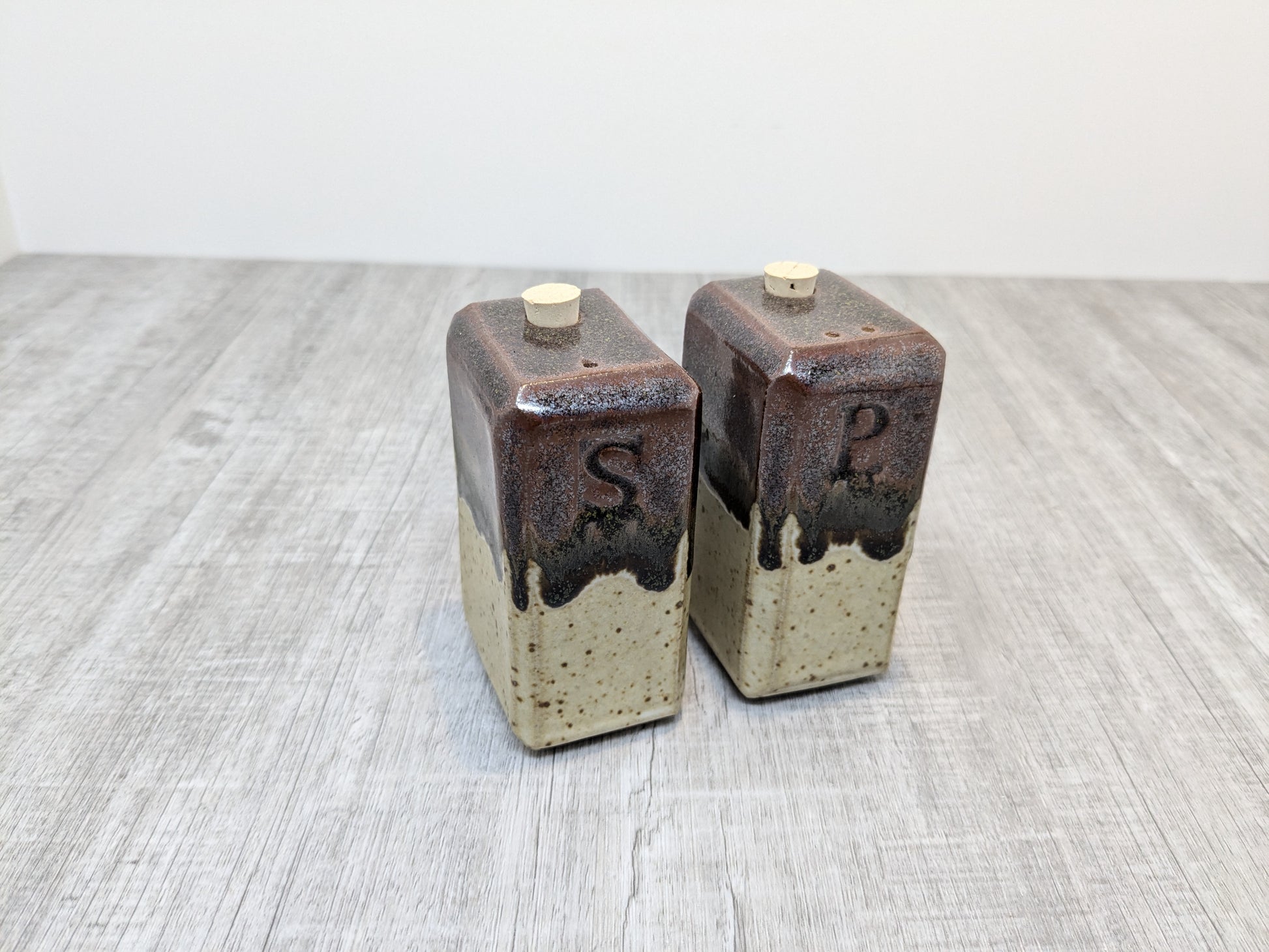 Hand built Rectangular salt and pepper shakers. Oatmeal and Tenmoku drip glaze.