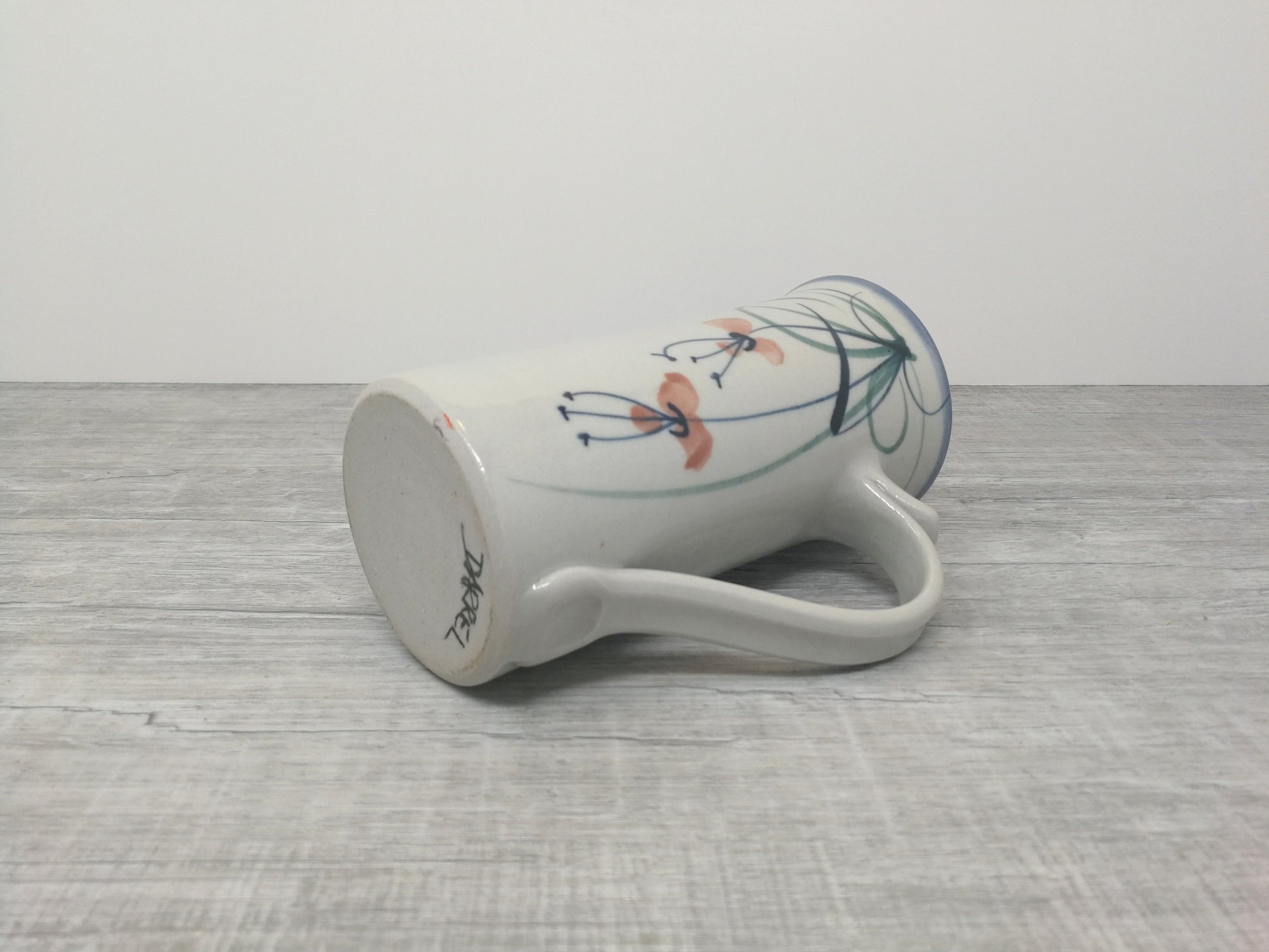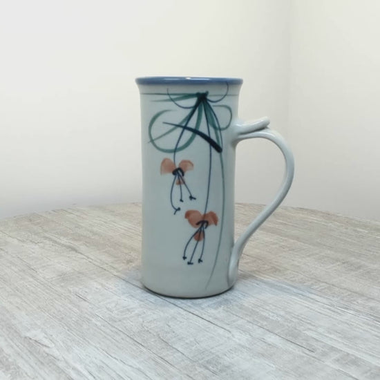Darrel Hancock studio pottery mug, tall slender mug with stylized flower design.