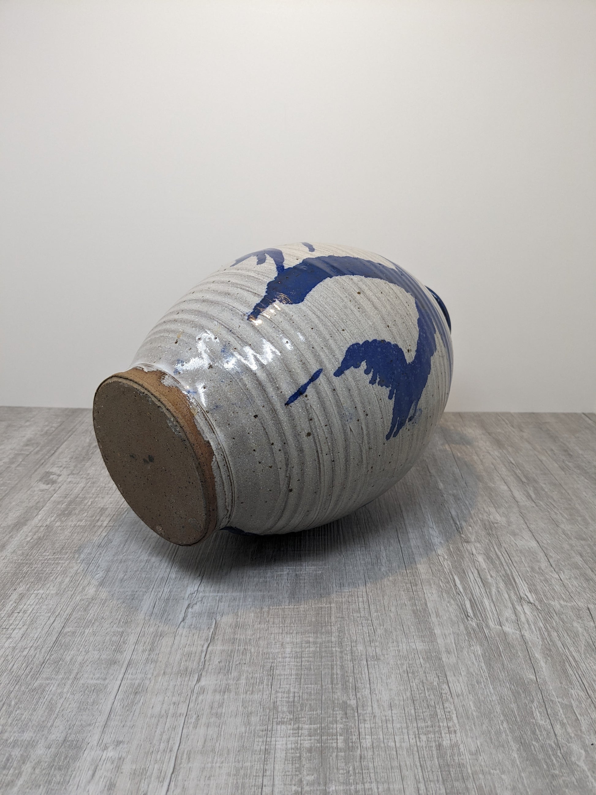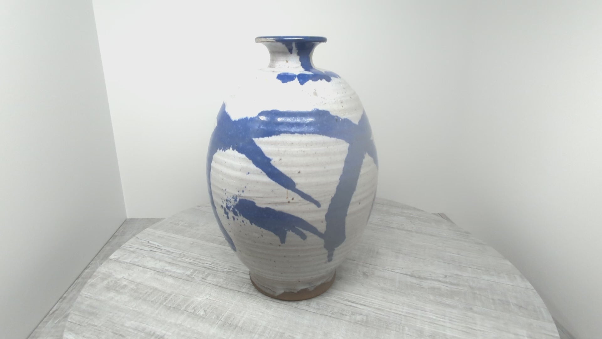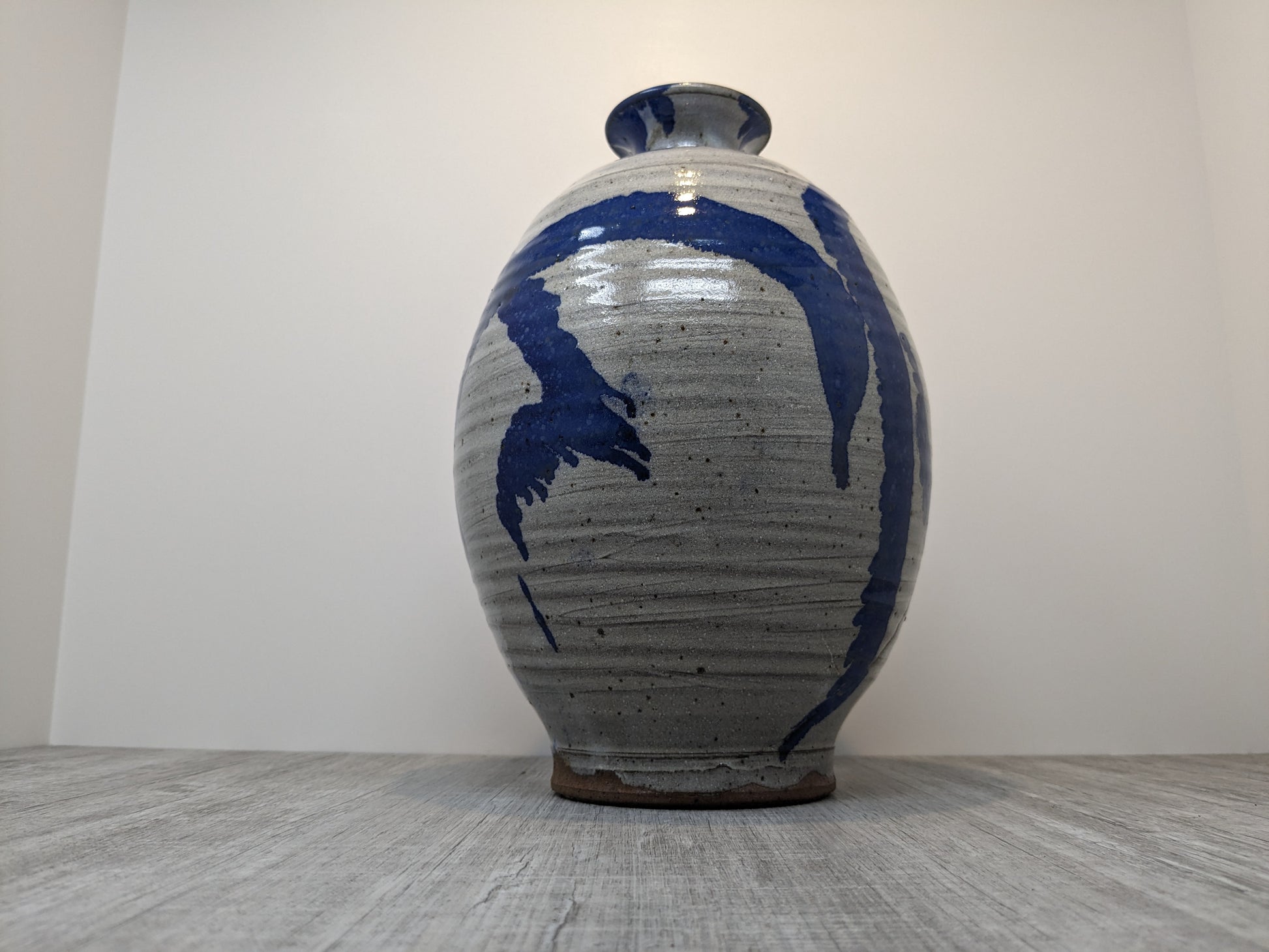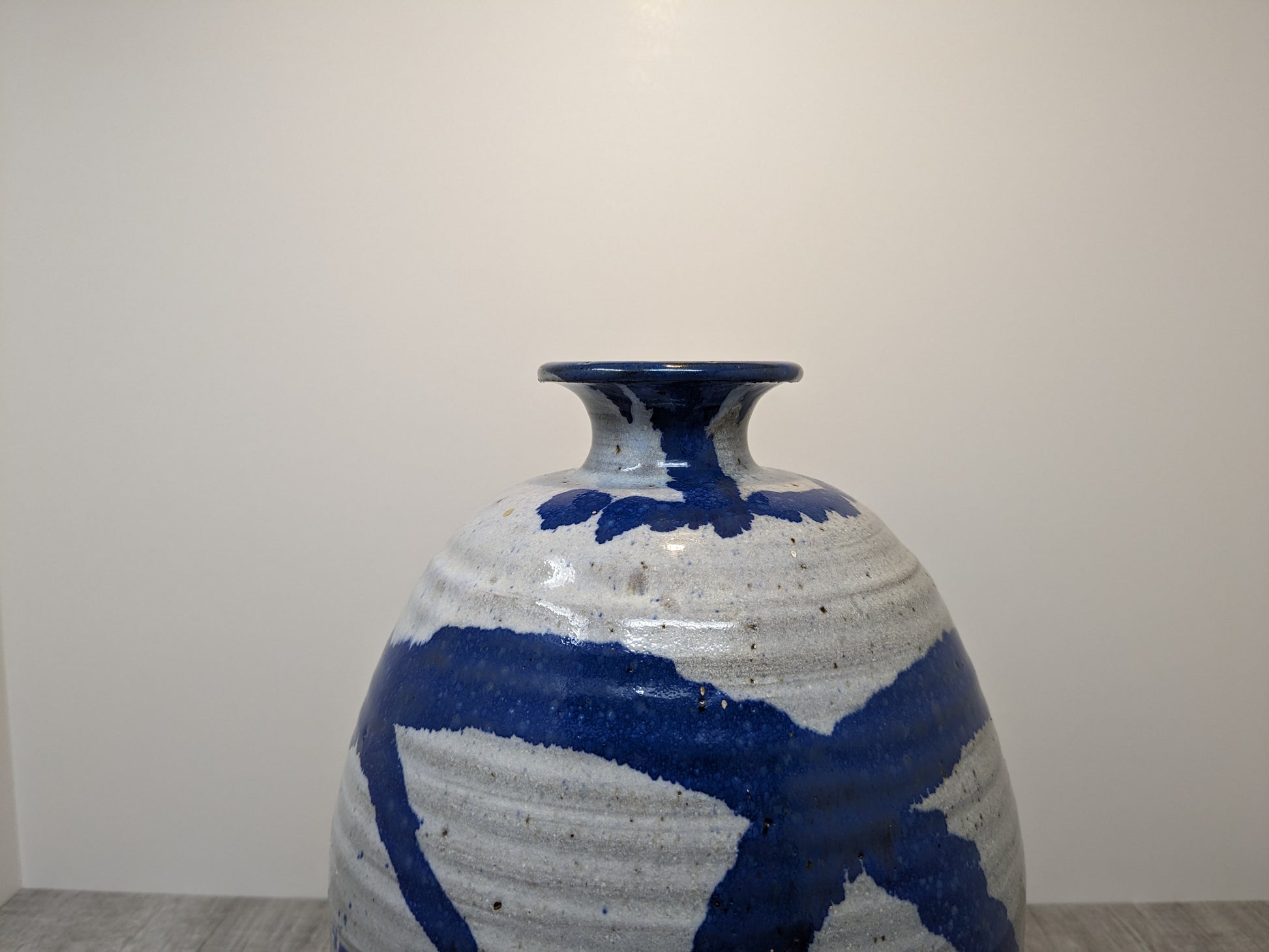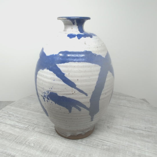 Studio Pottery Stoneware Vase | Bruce Vallance Hand Thrown Pottery | Oatmeal Glaze with Blue Brush Strokes