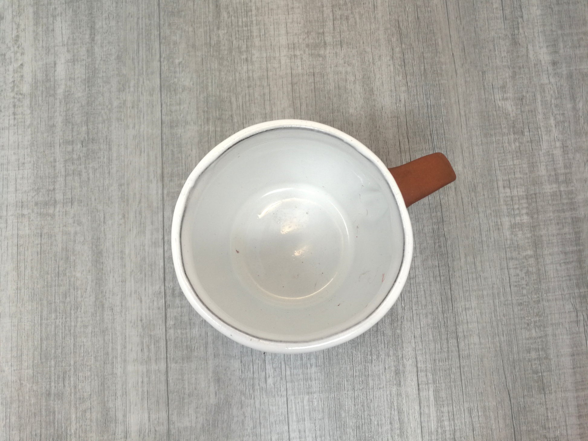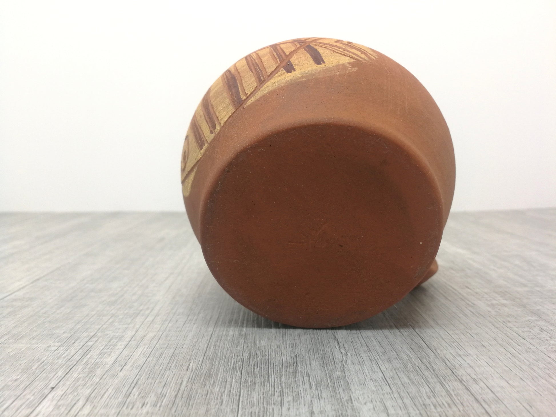 Mid Century ceramic mug with white inner glaze and fossilized fish design.