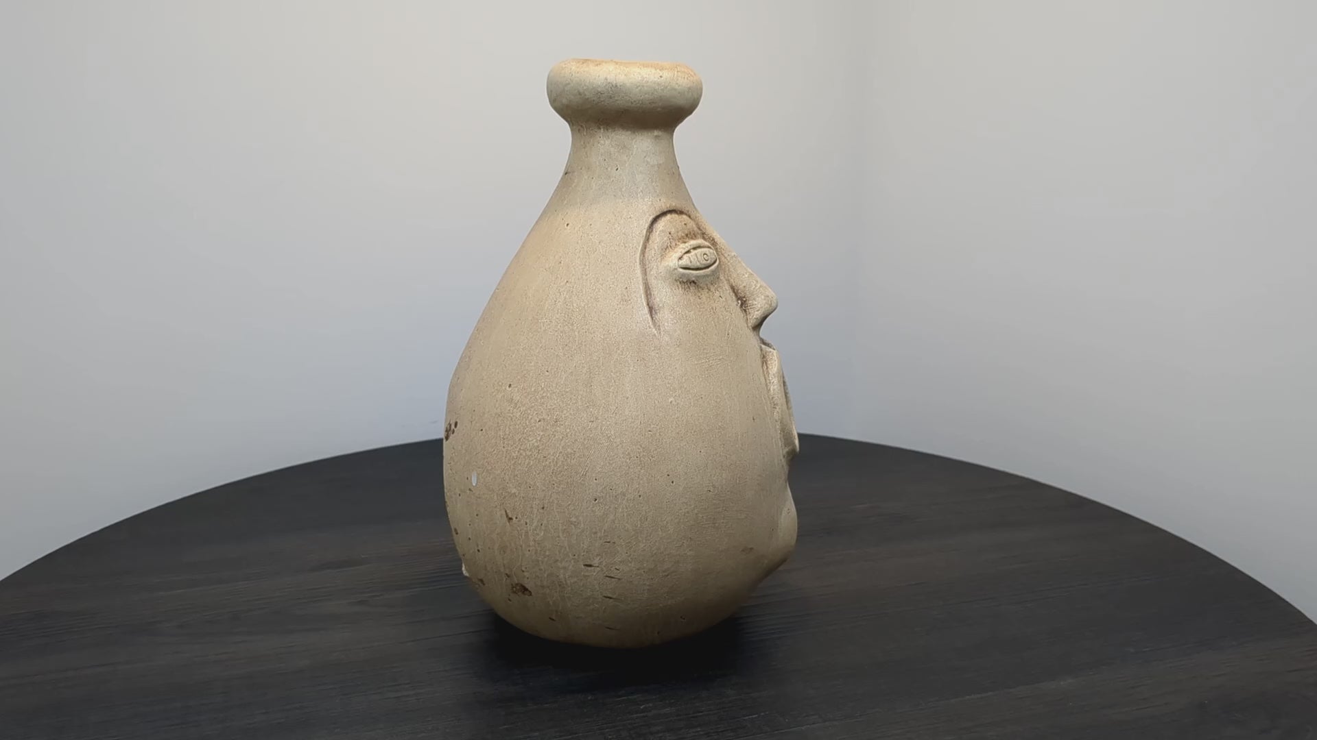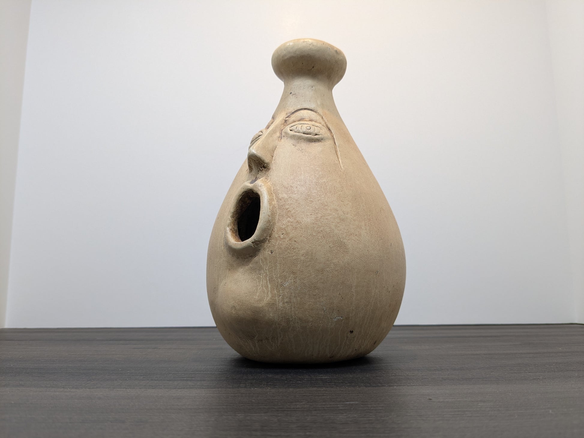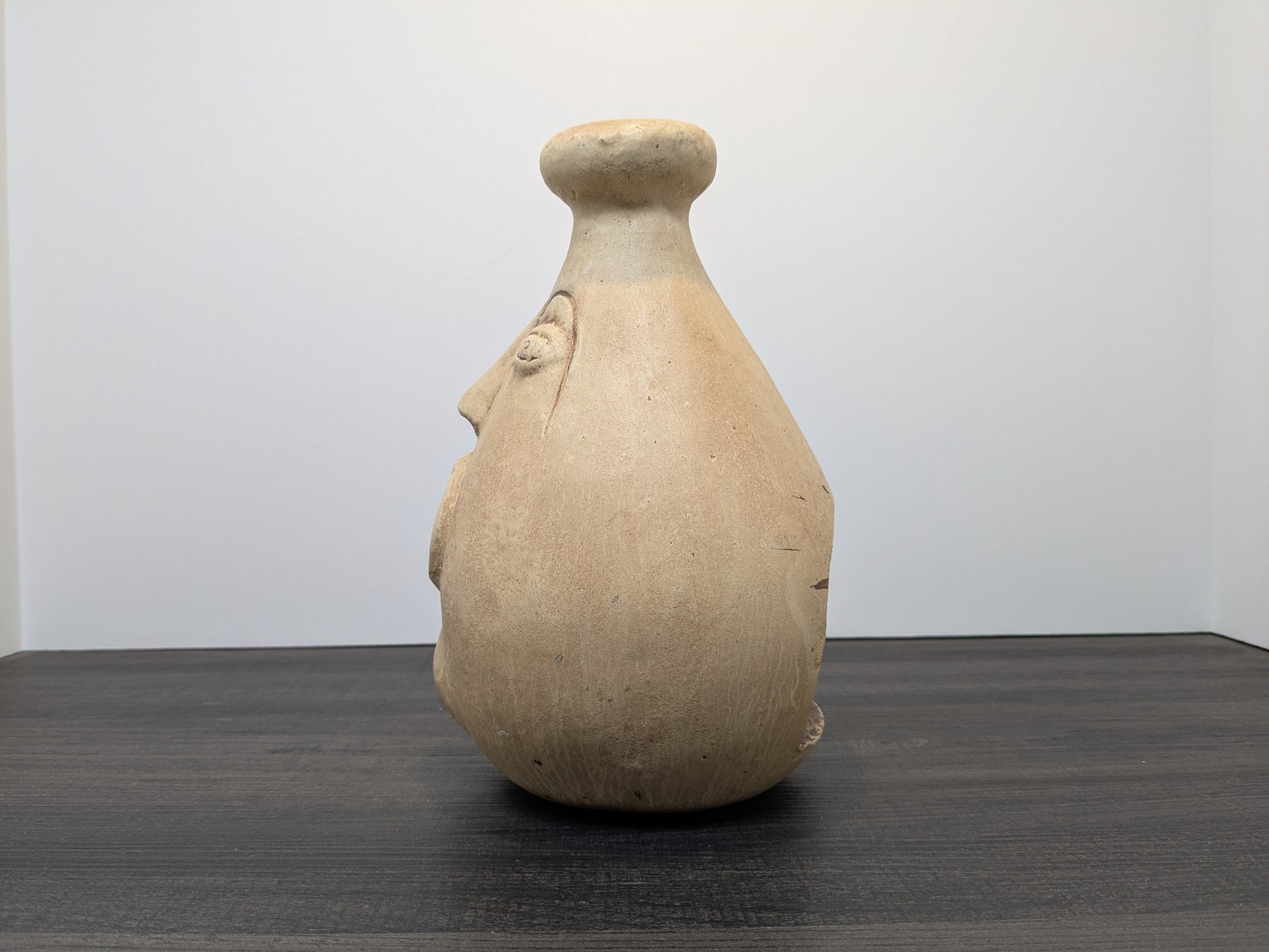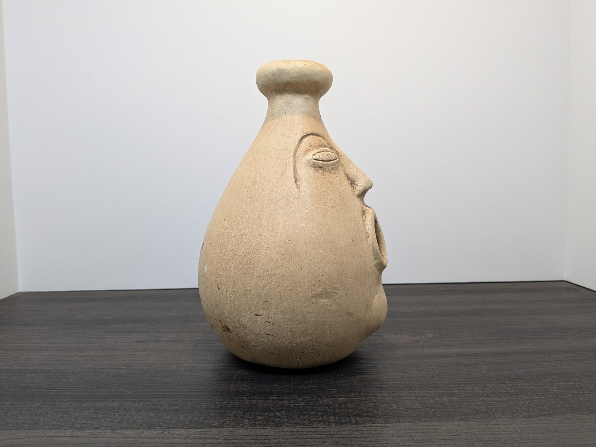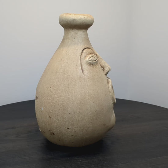 Vintage Mexican terracotta face Candle or incense burner from the 1960s–1970s. Piece combines folk art from Tonalá or Tlaquepaque with mid-century style. Hand-thrown with salt glaze, piece features detailed facial designs inspired by Pre-Columbian art. Designed to hold candles or incense, the piece has a natural patina, adding to their rustic look. Originally made as decorative objects, they bring a distinctive touch to eclectic or vintage interiors. Piece is marked "Made in Mexico" on the base. This piece has particularly fine facial details including chin, nose and eye details.