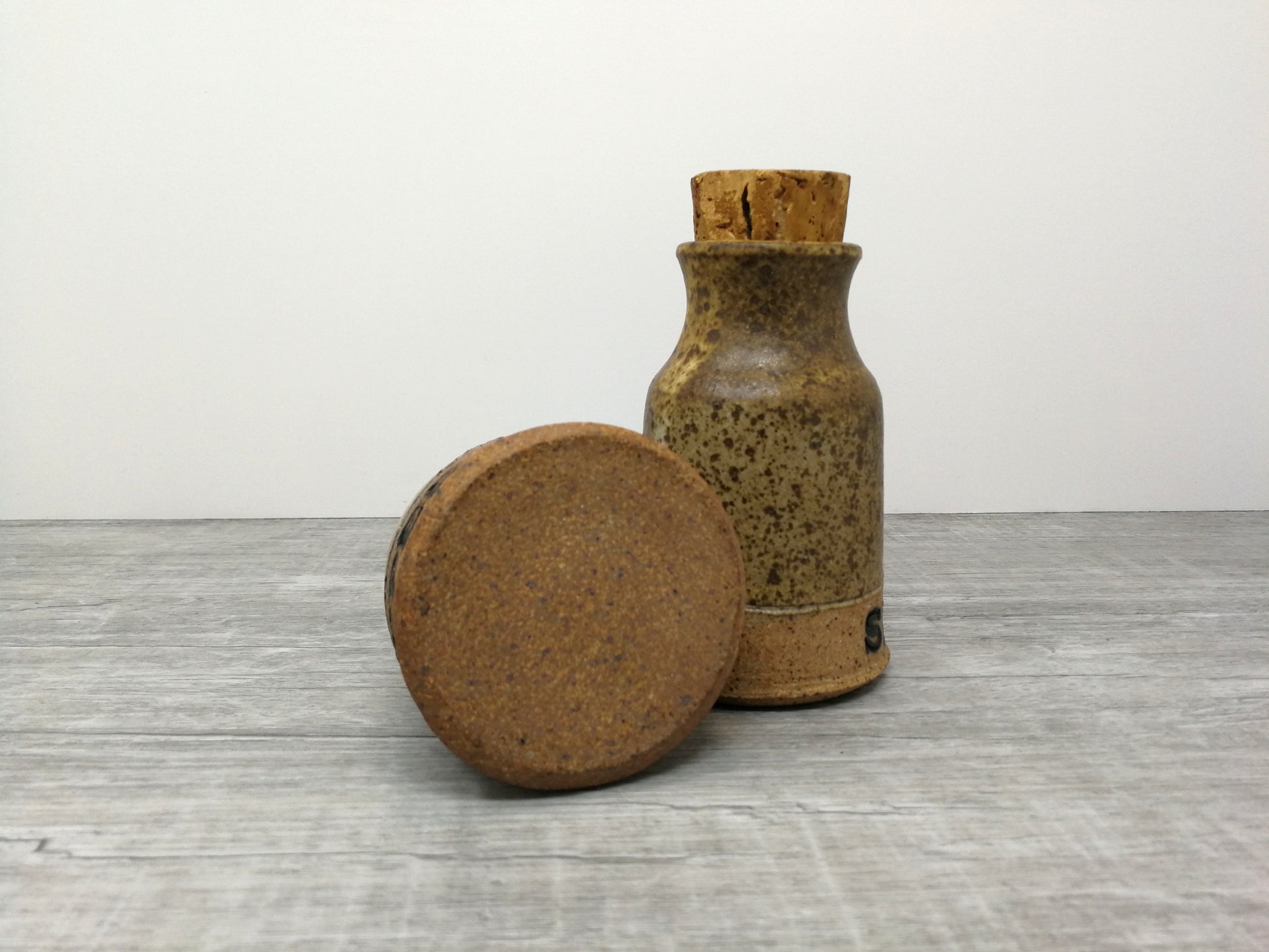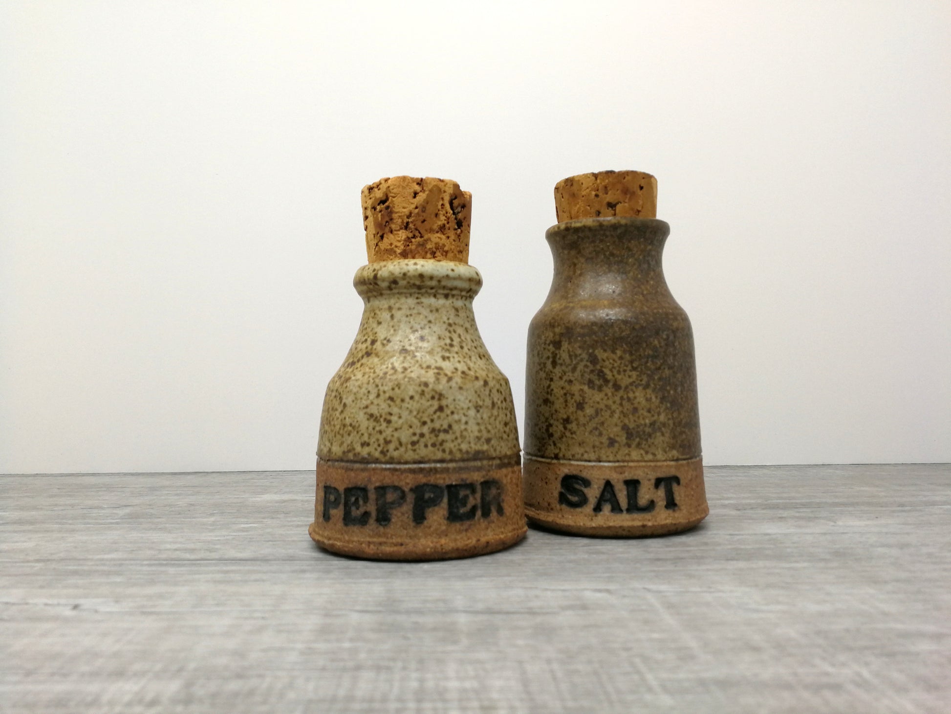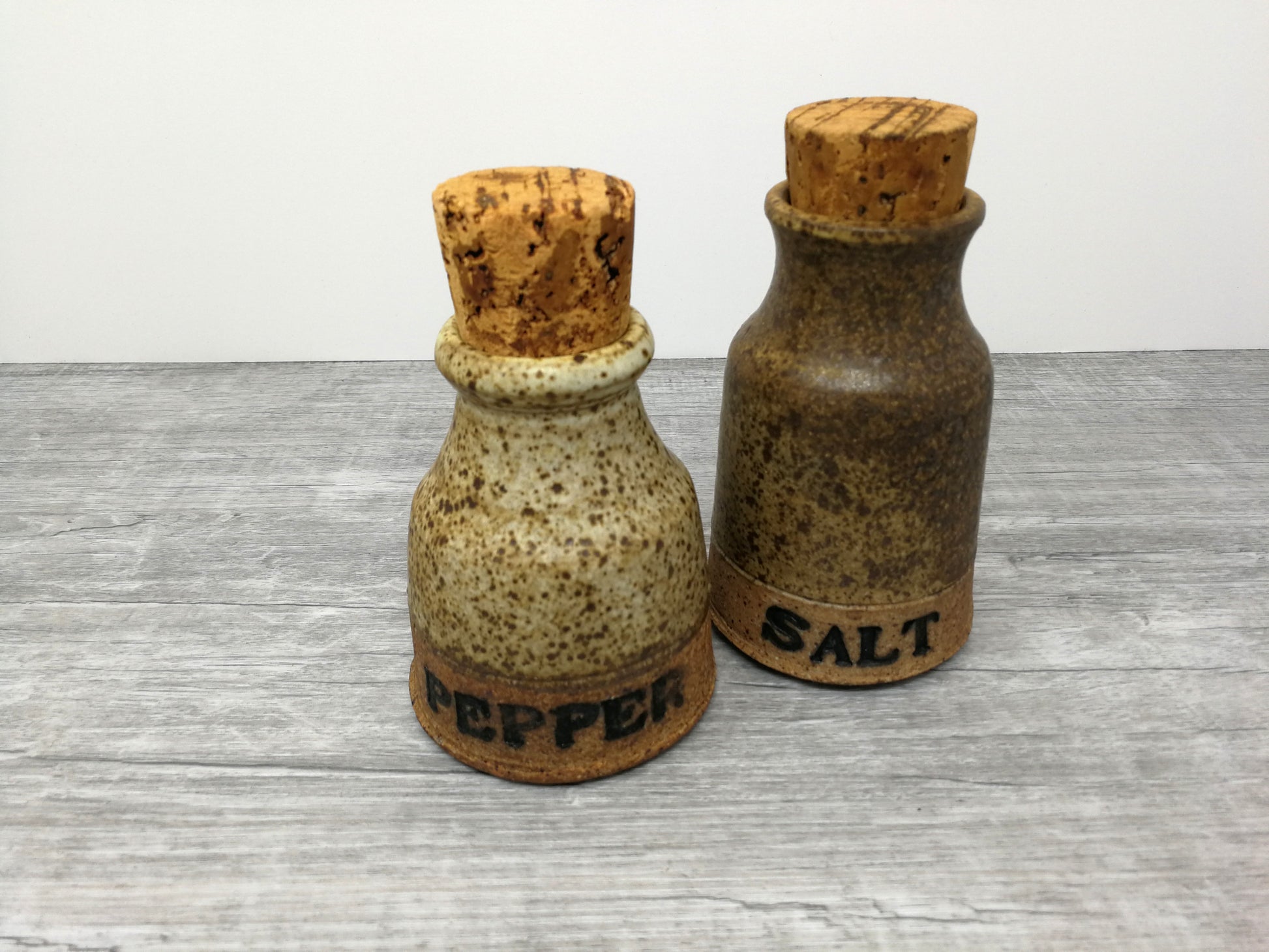 Set of salt and pepper containers. Hand thrown art pottery jars with cork stoppers.