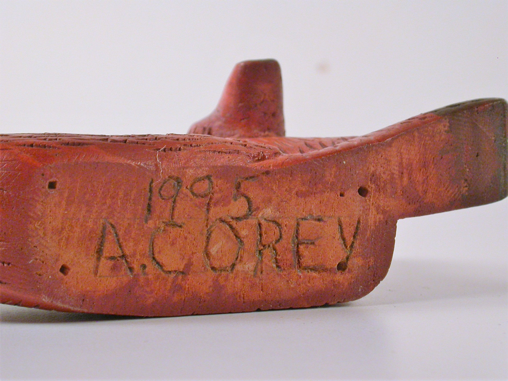 This is a well made wood carving, good proportion, detailing and color. Carved pine, red stain with black paint highlights. Signed A.Corey 1995